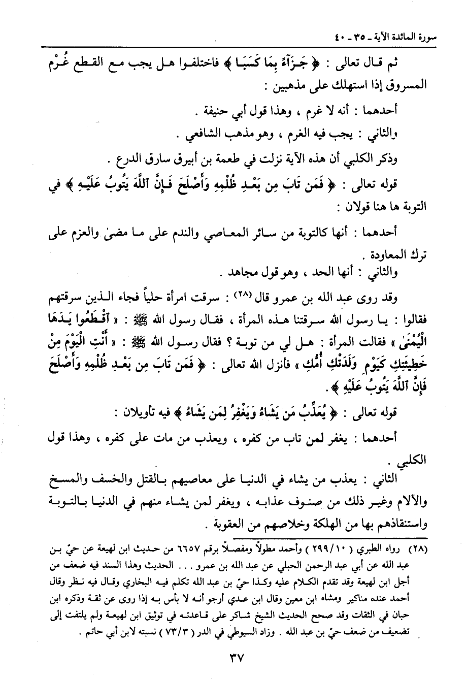 ثم قال تعالى: {جَزَآءً بِمَا كَسَبا} فاختلفوا هل يجب مع القطع غُرْم المسروق إذا استهلك على مذهبين: أحدهما: أنه لا غرم , وهذا قول أبي حنيفة. والثاني: يجب فيه الغرم , وهو مذهب الشافعي. وذكر الكلبي أن هذه الآية نزلت فى طعمة بن أبيرق سارق الدرع. قوله تعالى: {فَمَن تَابَ مِن بَعْدِ ظُلْمِهِ وَأَصْلَحَ فَإِنَّ اللَّهَ يَتُوبُ عَلَيْهِ} في التوبة ها هنا قولان: أحدهما: أنها كالتوبة من سائر المعاصي والندم على ما مضى والعزم على ترك المعاودة. والثاني: أنها الحد , وهو قول مجاهد. وقد روى عبد الله بن عمرو قال: سرقت امرأة حلياً فجاء الذين سرقتهم فقالوا: يا رسول الله سرقتنا هذه المرأة , فقال رسول الله صلى الله عليه وسلم: (اقْطَعُوا يَدَهَا الْيُمْنَى) فقالت المرأة: هل لي من توبة؟ فقال رسول الله صلى الله عليه وسلم: (أَنْتِ الْيَوْمَ مِنْ خَطِيئَتِكِ كَيَوْمِ وَلَدَتْكِ أُمُّكِ) فأنزل الله تعالى: {فَمَن تَابَ مِن بَعْدِ ظُلْمِهِ وَأَصْلَحَ فَإِنَّ اللَّهَ يَتُوبُ عَلَيْهِ}. قوله تعالى: {يُعَذِّبُ مَن يَشَاءُ ويَغْفِرُ لِمَن يَشَاءُ} فيه تأويلان: أحدهما: يغفر لمن تاب من كفره , ويعذب من مات على كفره , وهذا قول الكلبي. الثاني: يعذب من يشاء فى الدنيا على معاصيهم بالقتل والخسف والمسخ والآلام وغير ذلك من صنوف عذابه , ويغفر لمن يشاء منهم فى الدنيا بالتوبة واستنقاذهم بها من الهلكة وخلاصهم من العقوبة.