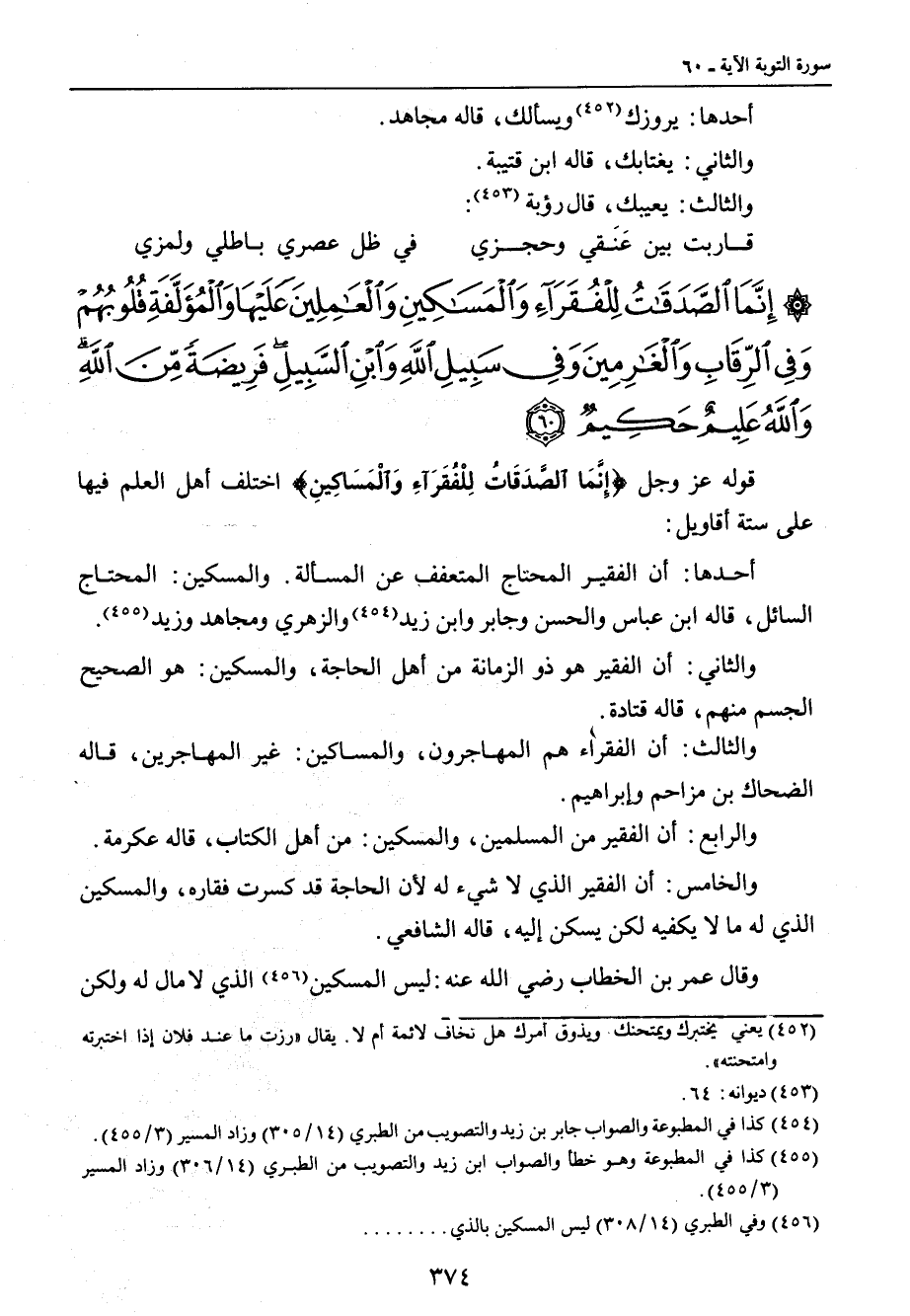 {إنما الصدقات للفقراء والمساكين والعاملين عليها والمؤلفة قلوبهم وفي الرقاب والغارمين وفي سبيل الله وابن السبيل فريضة من الله والله عليم حكيم} قوله عز وجل {إِنَّمَا الصَّدَقَاتُ لِلْفُقَرآءِ وَالْمَسَاكِينِ} اختلف أهل العلم فيها على ستة أقاويل: أحدها: أن الفقير المحتاج المتعفف عن المسألة. والمسكين: المحتاج السائل , قاله ابن عباس والحسن وجابر وابن زيد والزهري ومجاهد وزيد. والثاني: أن الفقير هو ذو الزمانة من أهل الحاجة , والمسكين: هو الصحيح الجسم منهم , قاله قتادة. والثالث: أن الفقراء هم المهاجرون , والمساكين: غير المهاجرين , قاله الضحاك بن مزاحم وإبراهيم. والرابع: أن الفقير من المسلمين , والمسكين: من أهل الكتاب , قاله عكرمة. والخامس: أن الفقير الذي لا شيء له لأن الحاجة قد كسرت فقاره , والمسكين الذي له ما لا يكفيه لكن يسكن إليه , قاله الشافعي. وقال عمر بن الخطاب رضي الله عنه: ليس المسكين الذي لا مال له ولكن