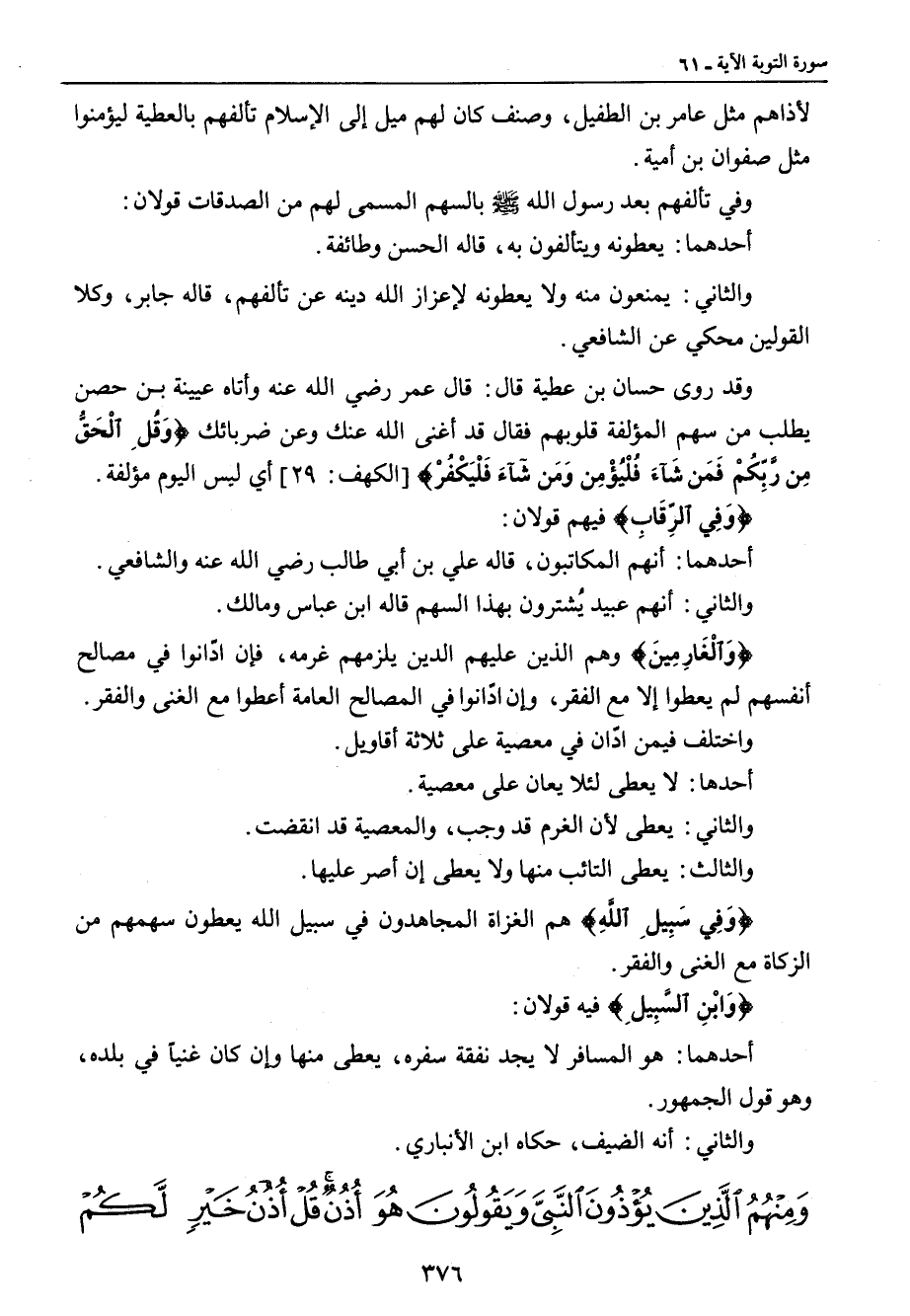 لأذاهم مثل عامر بن الطفيل , وصنف كان لهم ميل إلى الإسلام تألفهم بالعطية ليؤمنوا مثل صفوان بن أمية. وفي تألفهم بعد رسول الله صلى الله عليه وسلم بالسهم المسمى لهم من الصدقات قولان: أحدهما: يعطونه ويتألفون به , قاله الحسن وطائفة. والثاني: يمنعون منه ولا يعطونه لإعزاز الله دينه عن تألفهم , قاله جابر , وكلا القولين محكي عن الشافعي. وقد روى حسان بن عطية قال: قال عمر رضي الله عنه وأتاه عيينة بن حصن يطلب من سهم المؤلفة قلوبهم فقال قد أغنى الله عنك وعن ضربائك {وَقُلِ الْحَقُّ مِن رَّبِّكُمْ فَمَن شَآءَ فَلْيُؤْمِن وَمَن شَآءَ فَلْيَكْفُرْ} {الكهف: 29) أي ليس اليوم مؤلفة. {وَفِي الرِّقابِ} فيهم قولان: أحدهما: أنهم المكاتبون , قاله علي بن أبي طالب رضي الله عنه والشافعي. والثاني: أنهم عبيد يُشترون بهذا السهم قاله ابن عباس ومالك. {وَاْلْغَارِمِينَ} وهم الذين عليهم الدين يلزمهم غرمه , فإن ادّانوا في مصالح أنفسهم لم يعطوا إلا مع الفقر , وإن ادّانوا في المصالح العامة أعطوا مع الغنى والفقر. واختلف فيمن ادّان في معصية على ثلاثة أقاويل: أحدها لا يعطى لئلا يعان على معصية. والثاني: يعطى لأن الغرم قد وجب , والمعصية قد انقضت. والثالث: يعطى التائب منها ولا يعطى إن أصر عليها. {وَفِي سَبِيلِ اللَّهِ} هم الغزاة المجاهدون في سبيل الله يعطون سهمهم من الزكاة مع الغنى والفقر. {وَابْنِ السَّبِيلِ} فيه قولان: أحدهما: هو المسافر لا يجد نفقة سفره , يعطى منها وإن كان غنياً في بلده , وهو قول الجمهور. والثاني: أنه الضيف , حكاه ابن الأنباري.