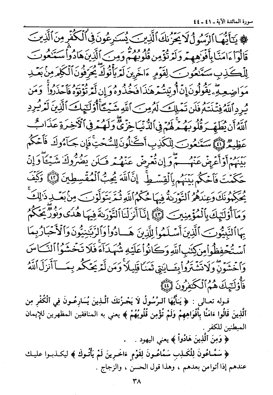{يا أيها الرسول لا يحزنك الذين يسارعون في الكفر من الذين قالوا آمنا بأفواههم ولم تؤمن قلوبهم ومن الذين هادوا سماعون للكذب سماعون لقوم آخرين لم يأتوك يحرفون الكلم من بعد مواضعه يقولون إن أوتيتم هذا فخذوه وإن لم تؤتوه فاحذروا ومن يرد الله فتنته فلن تملك له من الله شيئا أولئك الذين لم يرد الله أن يطهر قلوبهم لهم في الدنيا خزي ولهم في الآخرة عذاب عظيم سماعون للكذب أكالون للسحت فإن جاؤوك فاحكم بينهم أو أعرض عنهم وإن تعرض عنهم فلن يضروك شيئا وإن حكمت فاحكم بينهم بالقسط إن الله يحب المقسطين وكيف يحكمونك وعندهم التوراة فيها حكم الله ثم يتولون من بعد ذلك وما أولئك بالمؤمنين إنا أنزلنا التوراة فيها هدى ونور يحكم بها النبيون الذين أسلموا للذين هادوا والربانيون والأحبار بما استحفظوا من كتاب الله وكانوا عليه شهداء فلا تخشوا الناس واخشون ولا تشتروا بآياتي ثمنا قليلا ومن لم يحكم بما أنزل الله فأولئك هم الكافرون} قوله تعالى: {يَأَيُّهَا الرَّسُولُ لاَ يَحْزُنكَ الَّذِينَ يُسَارِعُونَ فِي الْكُفْرِ مِن الَّذِينَ قَالُواءَامَنَّا بِأَفْوَاهِهِمْ وَلَمْ تُؤْمِن قُلُوبُهُمْ} يعني به المنافقين المظهرين للإِيمان المبطنين للكفر. {وَمِنَ الَّذِينَ هَادُواْ} يعني اليهود. {سَمَّاعُونَ لِلْكَذِبِ سَمَّاعُونَ لِقَوْمٍءَاخَرِينَ لَمْ يَأْتُوكَ} ليكذبوا عليك عندهم إذا أتوا من بعدهم , وهذا قول الحسن , والزجاج.