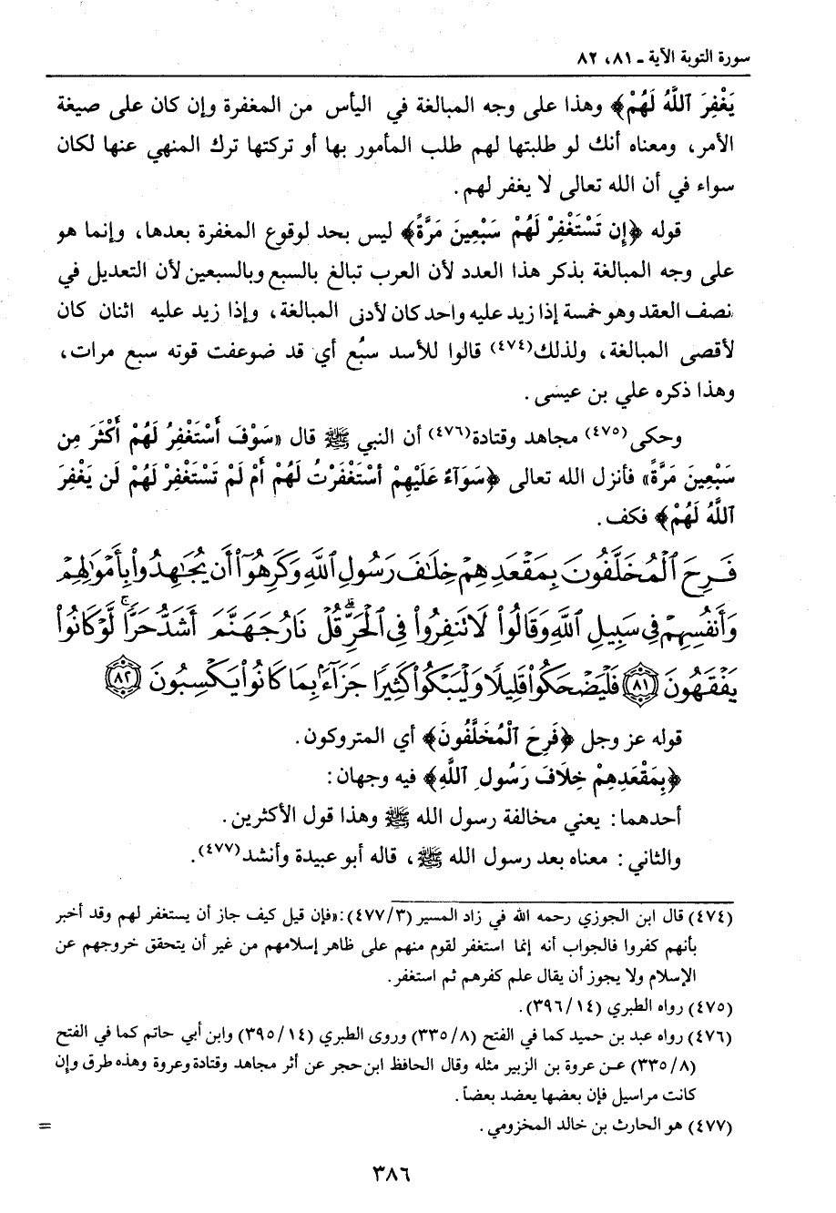يغفر الله لهم ذلك بأنهم كفروا بالله ورسوله والله لا يهدي القوم الفاسقين} قوله عز وجل {اسْتَغْفِرْ لَهُمْ أَوْ لاَ تَسْتَغْفِرْ لَهُمْ إِن تَسْتَغْفِرْ لَهُمْ سَبْعِينَ مَرَّةً فَلَن يَغْفِرَ اللَّهُ لَهُمْ} وهذا على وجه المبالغة في اليأس من المغفرة وإن كان على صيغة الأمر , ومعناه أنك لو طلبتها لهم طلب المأمور بها أو تركتها ترك المنهي عنها لكان سواء في أن الله تعالى لا يغفر لهم. قوله {إِن تَسْتَغْفِرْ لَهُمْ سَبْعِينَ مَرَّةً} ليس بحد لوقوع المغفرة بعدها , وإنما هو على وجه المبالغة بذكر هذا العدد لأن العرب تبالغ بالسبع والسبعين لأن التعديل في نصف العقد وهو خمسة إذا زيد عليه واحد كان لأدنى المبالغة , وإذا زيد عليه اثنان كان لأقصى المبالغة , ولذلك قالوا للأسد سبُع أي قد ضوعفت قوته سبع مرات , وهذا ذكره علي بن عيسى. وحكى مجاهد وقتادة أن النبي صلى الله عليه وسلم قال (سَوْفَ أَسْتَغْفِرُ لُهُمْ أَكْثَرَ مِن سَبْعِينَ مَرَّةً) فأنزل الله تعالى {سَوَآءٌ عَلَيْهِمْ أَسْتَغْفَرْتُ لَهُمْ أَمْ لَمْ تَسْتَغْفِرْ لَهُمْ لَن يَغْفِرَ اللَّهُ لَهُمْ} فكف.