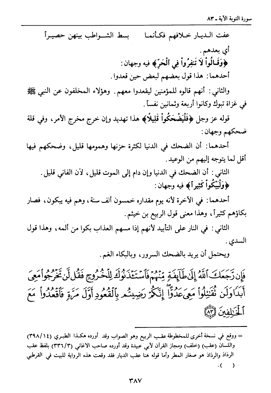 أي بعدهم. {وَقَالُواْ لاَ تَنفِرُواْ فِي الْحَرِّ} فيه وجهان: أحدهما: هذا قول بعضهم لبعض حين قعدوا. والثاني: أنهم قالوه للمؤمنين ليقعدوا معهم , وهؤلاء المخلفون عن النبي صلى الله عليه وسلم في غزاة تبوك وكانوا أربعة وثمانين نفساً. قوله عز وجل {فَلْيَضْحَكُواْ قَلِيلاً} هذا تهديد وإن خرج مخرج الأمر , وفي قلة ضحكهم وجهان: أحدهما: أن الضحك في الدنيا لكثرة حزنها وهمومها قليل , وضحكهم فيها أقل لما يتوجه إليهم من الوعيد. الثاني: أن الضحك في الدنيا وإن دام إلى الموت قليل , لأن الفاني قليل. {وَلْيَبْكُواْ كَثِيراً} فيه وجهان: أحدهما: في الآخرة لأنه يوم مقداره خمسون ألف سنة , وهم فيه يبكون , فصار بكاؤهم كثيراً , وهذا معنى قول الربيع بن خيثم. الثاني: في النار على التأبيد لأنهم إذا مسهم العذاب بكوا من ألمه , وهذا قول السدي. ويحتمل أن يريد بالضحك السرور , وبالبكاء الغم.