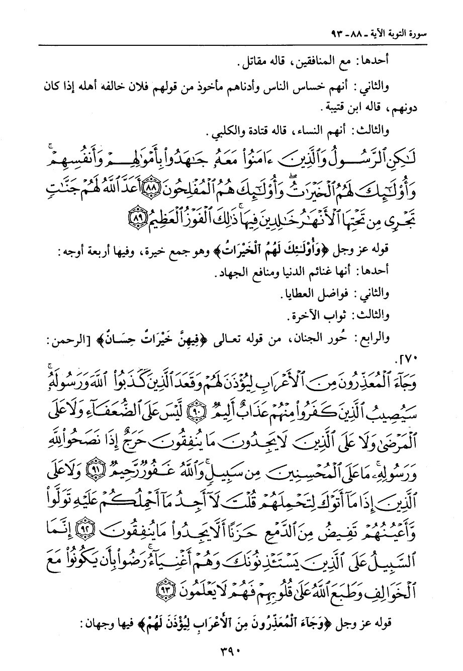 {لكن الرسول والذين آمنوا معه جاهدوا بأموالهم وأنفسهم وأولئك لهم الخيرات وأولئك هم المفلحون أعد الله لهم جنات تجري من تحتها الأنهار خالدين فيها ذلك الفوز العظيم} قوله عز وجل {وَأُوْلَئِكَ لَهُمُ الْخَيْرَاتُ} وهو جمع خيرة , وفيها أربعة أوجه: أحدها: أنها غنائم الدنيا ومنافع الجهاد. والثاني: فواضل العطايا. والثالث: ثواب الآخرة. والرابع: حُور الجنان , من قوله تعالى {فِيهِنَّ خَيْرَاتٌ حِسَانٌ} [الرحمن: 70].