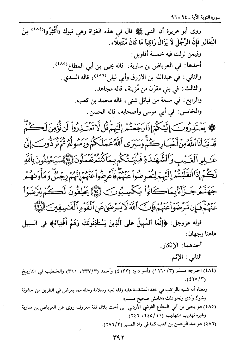 روى أبو هريرة أن النبي صلى الله عليه وسلم قال في هذه الغزاة وهي تبوك (أَكْثِرُوا مِنَ النِّعَالِ فَإِنَّ الرَّجُلَ لاَ يَزَالُ رَاكباً مَا كَانَ مُنْتَعِلاً). وفيمن نزلت فيه خمسة أقاويل: أحدها: في العرباض بن سارية , قاله يحيى بن أبي المطاع. والثاني: في عبد الله بن الأزرق وأبي ليلى , قاله السدي. والثالث: في بني مقرّن من مُزينة , قاله مجاهد. والرابع: في سبعة من قبائل شتى , قاله محمد بن كعب. والخامس: في أبي موسى وأصحابه , قاله الحسن.