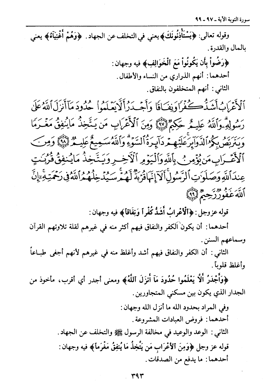 {الأعراب أشد كفرا ونفاقا وأجدر ألا يعلموا حدود ما أنزل الله على رسوله والله عليم حكيم ومن الأعراب من يتخذ ما ينفق مغرما ويتربص بكم الدوائر عليهم دائرة السوء والله سميع عليم ومن الأعراب من يؤمن بالله واليوم الآخر ويتخذ ما ينفق قربات عند الله وصلوات الرسول ألا إنها قربة لهم سيدخلهم الله في رحمته إن الله غفور رحيم} قوله عز وجل: {الأعْرابُ أَشَدُّ كُفْراً وَنِفَاقاً} فيه وجهان: أحدهما: أن يكون الكفر والنفاق فيهم أكثر منه في غيرهم لقلة تلاوتهم القرآن وسماعهم السنن. الثاني: أن الكفر والنفاق فيهم أشد وأغلظ منه في غيرهم لأنهم أجفى طباعاً وأغلظ قلوباً. {وَأَجْدَرُ أَلاَّ يَعْلَمُوا حُدُودَ مَآ أَنزَلَ اللَّهُ} ومعنى أجدر أي أقرب , مأخوذ من الجدار الذي يكون بين مسكني المتجاورين. وفي المراد بحدود الله ما أنزل الله وجهان: أحدهما: فروض العبادات المشروعة. الثاني: الوعد والوعيد في مخالفة الرسول صلى الله عليه وسلم والتخلف عن الجهاد. قوله عز وجل {وَمِنَ الأَعْرَابِ مَن يَتَّخِذُ مَا يُنفِقُ مَغْرَماً} فيه وجهان: أحدهما: ما يدفع من الصدقات.
