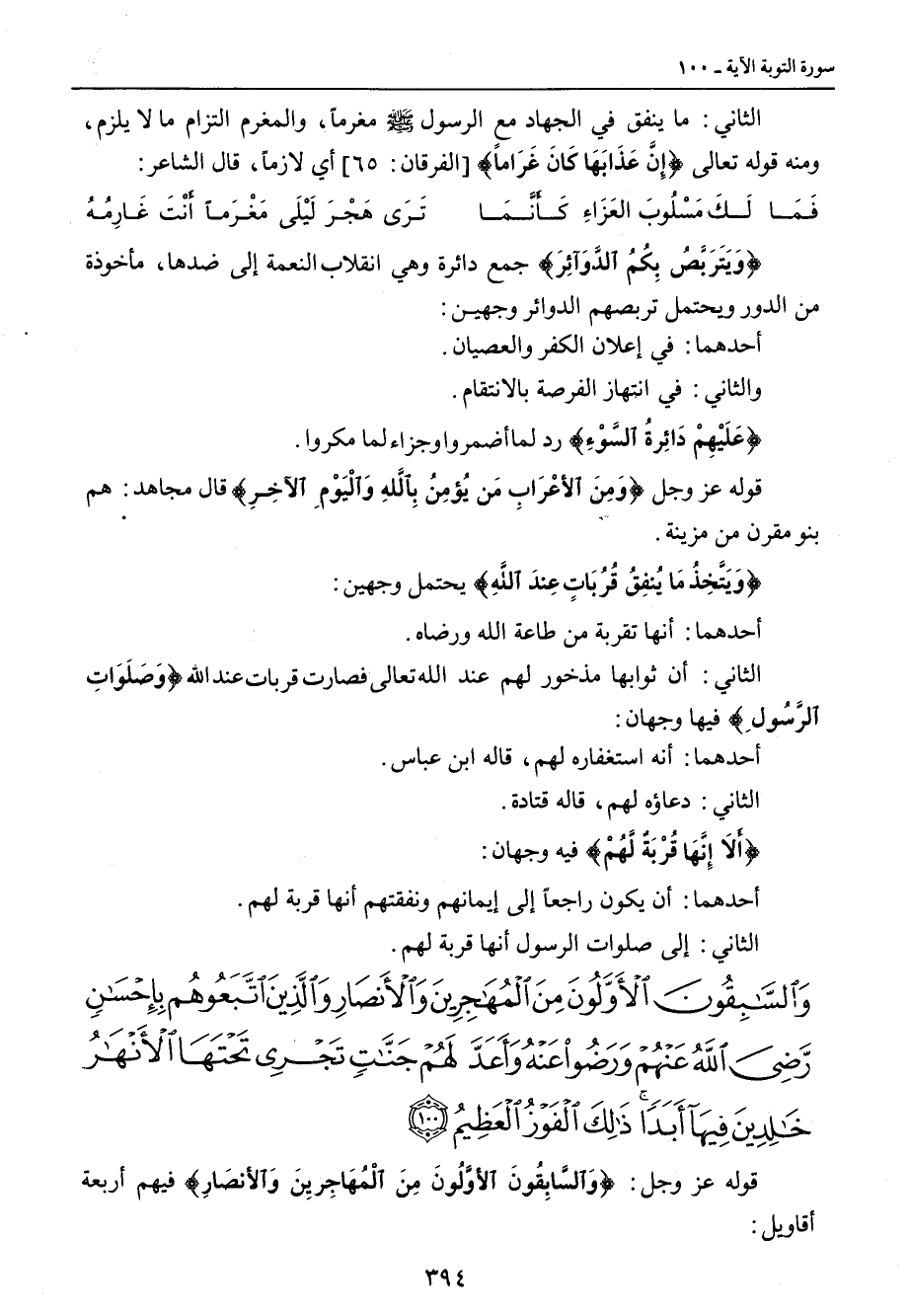 {وَيَتَرَبَّصُ بِكُمُ الدَّوَآئِرَ} جمع دائرة وهي انقلاب النعمة إلى ضدها , مأخوذة من الدور ويحتمل تربصهم الدوائر وجهين: أحدهما: في إعلان الكفر والعصيان. والثاني: في انتهاز الفرصة بالانتقام. {عَلَيْهِمْ دَائِرَةُ السَّوْءِ} رد لما أضمروا وجزاء لما مكروا. قوله عز وجل {وَمِنَ الأَعْرَابِ مَن يُؤمِنُ بِاللَّهِ وَالْيَوْمِ الآخِرِ} قال مجاهد: هم بنو مقرن من مزينة. {وَيَتَّخِذُ مَا يُنفِقُ قُرُبَاتٍ عِندَ اللَّهِ} يحتمل وجهين: أحدهما: أنها تقربة من طاعة الله ورضاه. الثاني: أن ثوابها مذخور لهم عند الله تعالى فصارت قربات عند الله {وَصَلَوَاتِ الرَّسُولِ} فيها وجهان: أحدهما: أنه استغفاره لهم , قاله ابن عباس. الثاني: دعاؤه لهم , قاله قتادة. {أَلاَ إِنَّهَا قُرْبَةٌ لَّهُمْ} فيه وجهان: أحدهما: أن يكون راجعاً إلى إيمانهم ونفقتهم أنها قربة لهم. الثاني: إلى صلوات الرسول أنها قربة لهم.