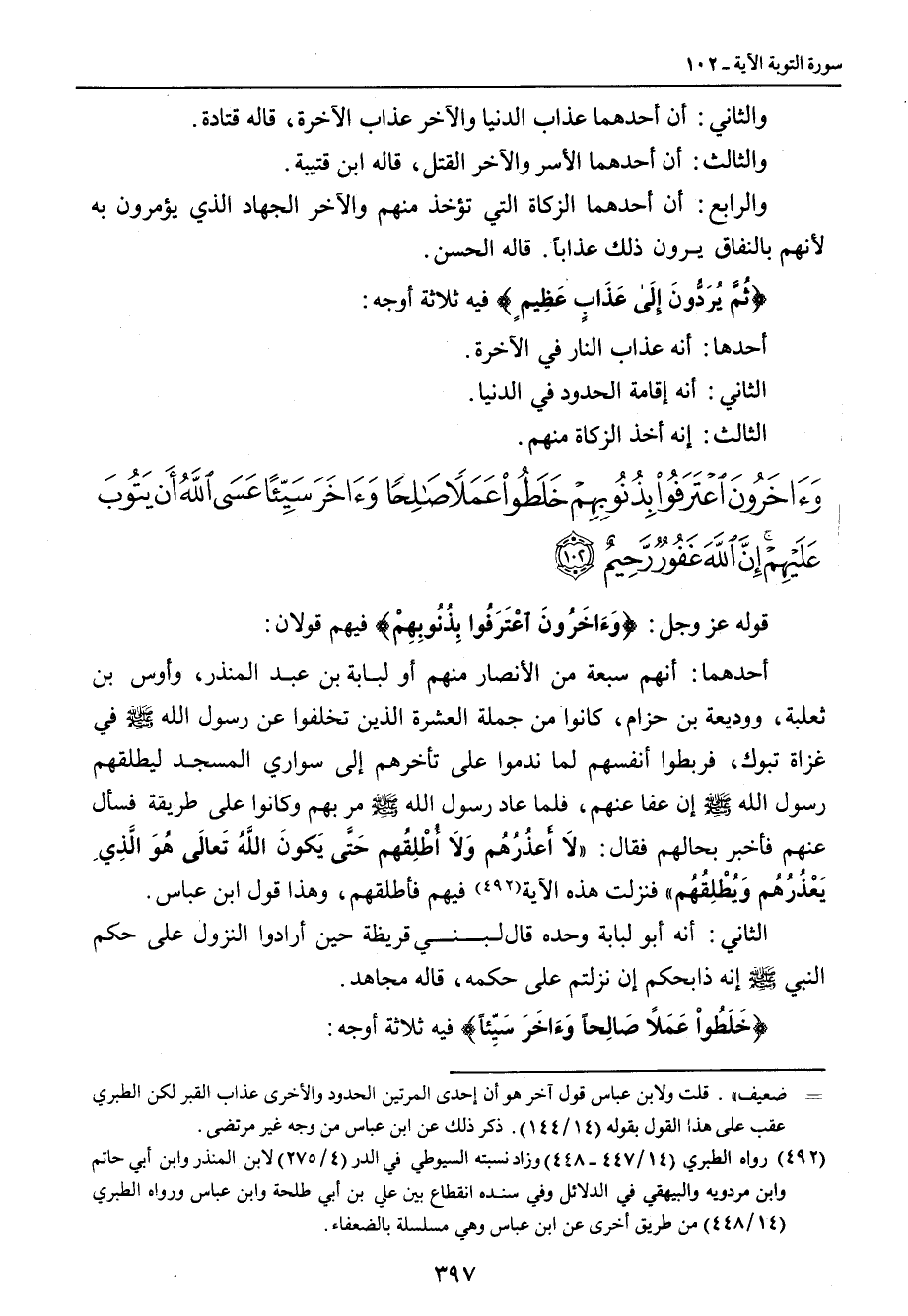 والثاني: أن أحدهما عذاب الدنيا والآخر عذاب الآخرة , قاله قتادة. والثالث: أن أحدهما الأسر والآخر القتل , قاله ابن قتيبة. والرابع: أن أحدهما الزكاة التي تؤخذ منهم والآخر الجهاد الذي يؤمرون به لأنهم بالنفاق يرون ذلك عذاباً. قال الحسن. {ثُمَّ يُرَدُّونَ إِلَى عَذَابٍ عَظِيمٍ} فيه ثلاثة أوجه: