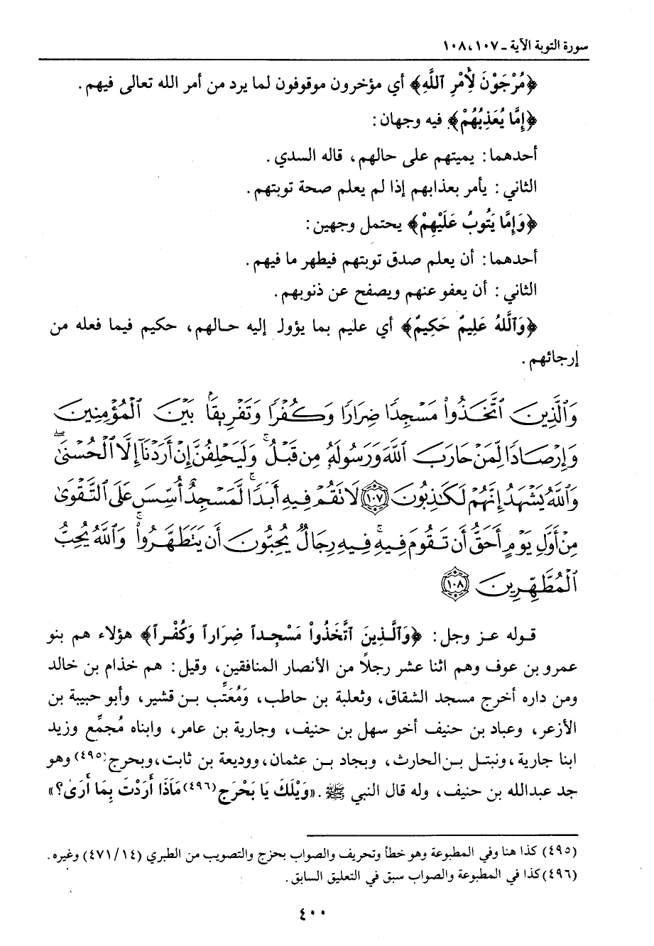 {والذين اتخذوا مسجدا ضرارا وكفرا وتفريقا بين المؤمنين وإرصادا لمن حارب الله ورسوله من قبل وليحلفن إن أردنا إلا الحسنى والله يشهد إنهم لكاذبون لا تقم فيه أبدا لمسجد أسس على التقوى من أول يوم أحق أن تقوم فيه فيه رجال يحبون أن يتطهروا والله يحب المطهرين} قوله عز وجل: {وَالَّذِينَ اتَّخَذُواْ مَسْجِداً ضِرَاراً وَكُفْراً} هؤلاء هم بنو عمرو بن عوف وهم اثنا عشر رجلاً من الأنصار المنافقين , وقيل: هم خذام بن خالد ومن داره أخرج مسجد الشقاق , وثعلبة بن حاطب , وَمُعَتِّب بن قشير , وأبو حبيبة بن الأزعر , وعباد بن حنيف أخو سهل بن حنيف , وجارية بن عامر , وابناه مُجمِّع وزيد ابنا جارية , ونبتل بن الحارث , وبجاد بن عثمان , ووديعة بن ثابت , وبحرج وهو جد عبد الله بن حنيف , وله قال النبي صلى الله عليه وسلم (وَيْلَكَ يَا بَحْرَج مَاذَا أَرَدْتَ بِمَا أَرَى؟)