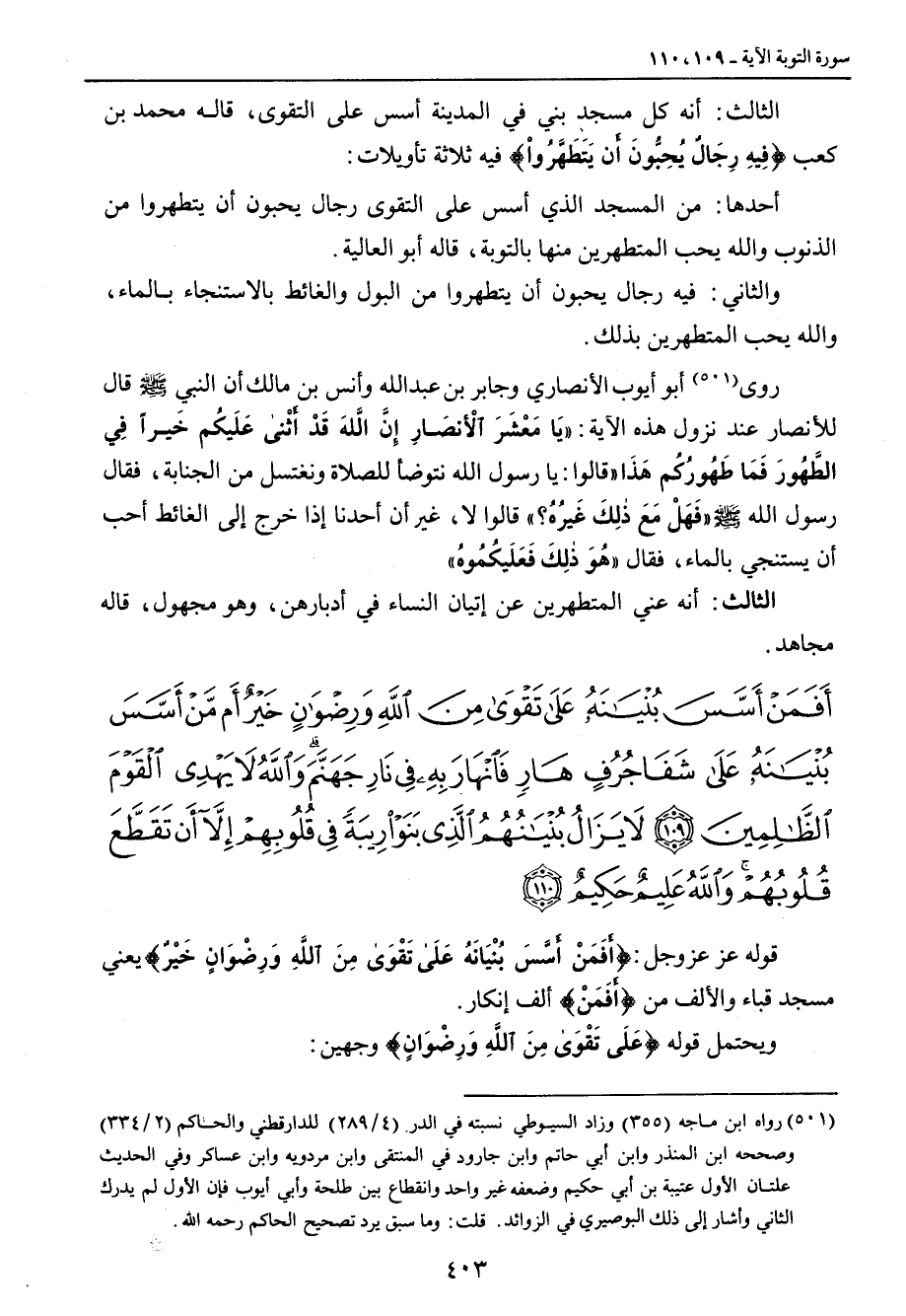 الثالث: أنه كل مسجد بني في المدينة أسس على التقوى , قاله محمد بن كعب {فِيهِ رِجَالٌ يُحِبُّونَ أَن يَتَطَهَّرُواْ} فيه ثلاثة تأويلات: أحدها: من المسجد الذي أسس على التقوى رجال يحبون أن يتطهروا من الذنوب والله يحب المتطهرين منها بالتوبة , قاله أبو العالية. والثاني: فيه رجال يحبون أن يتطهروا من البول والغائط بالاستنجاء بالماء. والله يحب المتطهرين بذلك. روى أبو أيوب الأنصاري وجابر بن عبد الله وأنس بن مالك أن النبي صلى الله عليه وسلم قال للأنصار عند نزول هذه الآية: (يَا مَعْشَرَ الأَنصَارِ إِنَّ اللَّهَ قَدْ أَثْنى عَلَيكُم خَيراً فِي الطَّهُورَ فَمَا طَهُورُكُم هَذَا) قالوا: يا رسول الله نتوضأ للصلاة ونغتسل من الجنابة , فقال رسول الله صلى الله عليه وسلم: (فَهَلْ مَعَ ذلِكَ غَيرُهُ؟) قالوا لا , غير أن أحدنا إذا خرج إلى الغائط أحب أن يستنجي بالماء , فقال: (هُوَ ذلِكَ فَعَلَيكُمُوهُ) الثالث: أنه عني المتطهرين عن إتيان النساء في أدبارهن , وهو مجهول , قاله مجاهد.