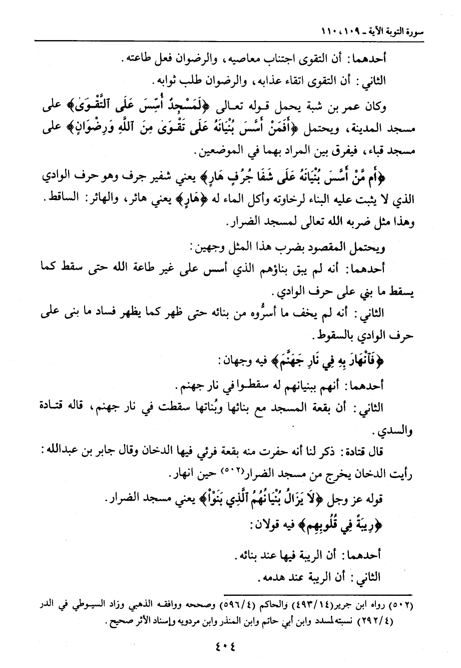 أحدهما: أن التقوى اجتناب معاصيه , والرضوان فعل طاعته. الثاني: أن التقوى اتقاء عذابه , والرضوان طلب ثوابه. وكان عمر بن شبة يحمل قوله تعالى {لَمَسْجِدٌ أُسِّسَ عَلَى التَّقْوَى} على مسجد المدينة , ويحتمل {أَفَمَنْ أَسَّسَ بُنْيَانَهُ عَلَى تَقْوَى مَنَ اللَّهِ وَرِضْوَانٍ} على مسجد قباء , فيفرق بين المراد بهما في الموضعين. {أَم مَّنْ أَسَّسَ بُنْيَانَهُ عَلَى شَفَا جُرُفٍ هَارٍ} يعني شفير جرف وهو حرف الوادي الذي لا يثبت عليه البناء لرخاوته وأكل الماء له {هَارٍ} يعني هائر , والهائر: الساقط. وهذا مثل ضربه الله تعالى لمسجد الضرار. ويحتمل المقصود بضرب هذا المثل وجهين: أحدهما: أنه لم يبق بناؤهم الذي أسس على غير طاعة الله حتى سقط كما يسقط ما بني على حرف الوادي. الثاني: أنه لم يخف ما أسرُّوه من بنائه حتى ظهر كما يظهر فساد ما بنى على حرف الوادي بالسقوط. {فَانْهَارَ بِهِ فِي نَارِ جَهَنَّمَ} فيه وجهان: أحدهما: أنهم ببنيانهم له سقطوا في نار جهنم. الثاني: أن بقعة المسجد مع بنائها وبُناتها سقطت في نار جهنم , قاله قتادة والسدي. قال قتادة: ذكر لنا أنه حفرت منه بقعة فرئي فيها الدخان وقال جابر بن عبد الله: رأيت الدخان يخرج من مسجد الضرار حين انهار. قوله عزوجل {لاَ يََزَالُ بُنْيَانُهُمُ الَّذِي بَنَوْاْ} يعني مسجد الضرار. {رِيبَةً فِي قُلُوبِهِم} فيه قولان: أحدهما: أن الريبة فيها عند بنائه. الثاني: أن الريبة عند هدمه.
