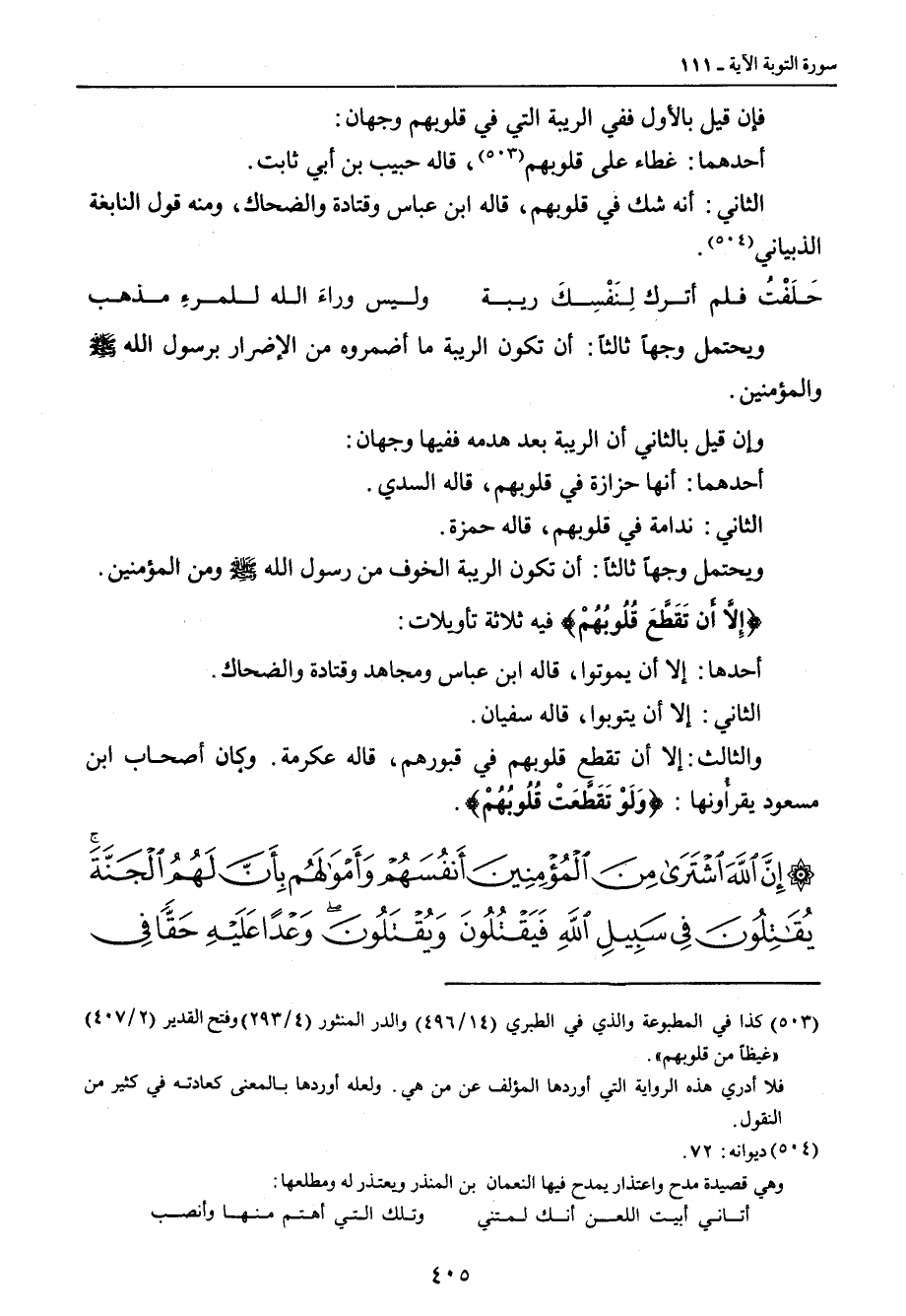 ويحتمل وجهاً ثالثاً: أن تكون الريبة ما أضمروه من الإضرار برسول الله صلى الله عليه وسلم والمؤمنين. وإن قيل بالثاني أن الريبة بعد هدمه ففيها وجهان: أحدهما: أنها حزازة في قلوبهم , قاله السدي. الثاني: ندامة في قلوبهم , قاله حمزة. ويحتمل وجهاً ثالثاً: أن تكون الريبة الخوف من رسول الله صلى الله عليه وسلم ومن المؤمنين. {إِلاَّ أَن تَقَطَّعَ قُلُوبُهُمْ} فيه ثلاثة تأويلات: أحدها: إلا أن يموتوا , قاله ابن عباس ومجاهد وقتادة والضحاك. الثاني: إلا أن يتوبوا , قاله سفيان. الثالث: إلا أن تقطع قلوبهم في قبورهم , قاله عكرمة. وكان أصحاب ابن مسعود يقرأُونها: {وَلَوْ تَقَطَّعَتْ قُلُوبُهُمْ}.