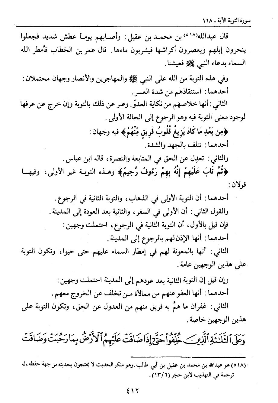 قال عبد الله بن محمد بن عقيل: وأصابهم يوماً عطش شديد فجعلوا ينحرون إبلهم ويعصرون أكراشها فيشربون ماءها , قال عمر بن الخطاب فأمطر الله السماء بدعاء النبي صلى الله عليه وسلم فغشينا. وفي هذه التوبة من الله على النبي صلى الله عليه وسلم والمهاجرين والأنصار وجهان محتملان: أحدهما: استنقاذهم من شدة العسر. والثاني: أنها خلاصهم من نكاية العدوّ. وعبر عن ذلك بالتوبة وإن خرج عن عرفها لوجود معنى التوبة فيه وهو الرجوع إلى الحالة الأولى. {مِن بَعْدِ مَا كَادَ يَزِيغُ قُلُوبُ فَرِيقٍ مِّنْهُمْ} فيه وجهان: أحدهما: تتلف بالجهد والشدة. والثاني: تعدِل عن الحق في المتابعة والنصرة , قاله ابن عباس. {ثُمَّ تَابَ عَلَيهِمْ إِنَّهُ بِهِمْ رَءُوفٌ رَّحِيمٌ} وهذه التوبة غير الأولى , وفيها قولان: أحدهما: أن التوبة الأولى في الذهاب , والتوبة الثانية في الرجوع. والقول الثاني: أن الأولى في السفر , والثانية بعد العودة إلى المدينة. فإن قيل بالأول , أن التوبة الثانية في الرجوع , احتملت وجهين: أحدهما: أنها الإذن لهم بالرجوع إلى المدينة. الثاني: أنها بالمعونة لهم في إمطار السماء عليهم حتى حيوا , وتكون التوبة على هذين الوجهين عامة. وإن قيل إن التوبة الثانية بعد عودهم إلى المدينة احتملت وجهين: أحدهما: أنها العفو عنهم من ممالأة من تخلف عن الخروج معهم. الثاني: غفران ما همَّ به فريق منهم من العدول عن الحق , وتكون التوبة على هذين الوجهين خاصة.