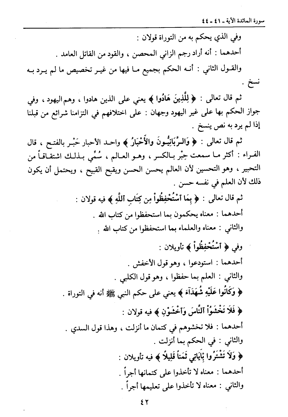 وفي الذي يحكم به من التوراة قولان: أحدهما: أنه أراد رجم الزاني المحصن , والقود من القاتل العامد. والقول الثاني: أنه الحكم بجميع ما فيها من غير تخصيص ما لم يرد به نسخ. ثم قال تعالى: {لِلَّذِينَ هَادُوا} يعني على الذين هادوا , وهم اليهود , وفي جواز الحكم بها على غير وجهان: على اختلافهم فى التزامنا شرائع من قبلنا إذا لم يرد به نص ينسخ. ثم قال تعالى: {وَالرَّبَانُّيِونَ والأَحْبَارُ} واحد الأحبار حَبْر بالفتح , قال الفراء , أكثر ما سمعت حِبْر بالكسر , وهو العالم , سُمِّي بذلك اشتقاقاً من التحبير , وهو التحسين لأن العالم يحسن الحسن ويقبح القبيح , ويحتمل أن يكون ذلك لأن العلم فى نفسه حسن. ثم قال تعالى: {بِمَا اسْتُحْفِظُواْ مِن كِتَابِ اللَّهِ} فيه قولان: أحدهما: معناه يحكمون بما استحفظوا من كتاب الله. والثاني: معناه والعلماء استحفظوا من كتاب الله. وفي {اسْتُحْفِظُواْ} تأويلان: أحدهما: استودعوا , وهو قول الأخفش. والثاني: العلم بما حفظوا , وهو قول الكلبي. {وَكَانُوا عَلَيْهِ شُهَدَآءَ} يعني على حكم النبي صلى الله عليه وسلم أنه في التوراة. {فَلاَ تَخْشَوُاْ النَّاسَ وَاخْشَوْنِ} فيه قولان: أحدهما: فلا تخشوهم فى كتمان ما أنزلت , وهذا قول السدي. والثاني: في الحكم بما أنزلت. {وَلاَ تَشْتَرُوا بِأَيَاتِي ثَمَناً قَلِيلاً} فيه تأويلان: أحدهما: معناه لا تأخذوا على كتمانها أجراً. والثاني: معناه لا تأخذوا على تعليمها أجراً.