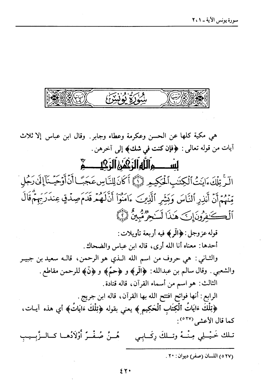 {الر تلك آيات الكتاب الحكيم أكان للناس عجبا أن أوحينا إلى رجل منهم أن أنذر الناس وبشر الذين آمنوا أن لهم قدم صدق عند ربهم قال الكافرون إن هذا لساحر مبين} قوله عز وجل: {الر} فيه أربعة تأويلات: أحدها: معناه أنا الله أرى , قاله ابن عباس والضحاك. والثاني: هي حروف من اسم الله الذي هو الرحمن , قاله سعيد بن جبير والشعبي. وقال سالم بن عبد الله: {الر} و {حمٌ} و {ن} للرحمن مقاطع. الثالث: هو اسم من أسماء القرآن , قاله قتادة. الرابع: أنها فواتح افتتح الله بها القرآن , قاله ابن جريج. {تِلْكَءَايَاتُ الْكِتَابِ الْحَكِيمِ} يعني بقوله {تِلْكَءَايَاتُ} أي هذه آيات , كما قال الأعشى:
