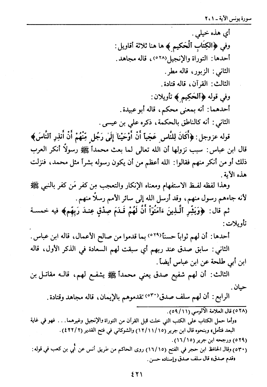 أي هذه خيلي. وفي {الكِتَابِ الْحِكيمِ} ها هنا ثلاثة أقاويل: أحدها: التوراة والإنجيل , قاله مجاهد. الثاني: الزبور , قاله مطر. الثالث: القرآن , قاله قتادة. وفي قوله {الحَكِيمِ} تأويلان: أحدهما: أنه بمعنى محكم , قاله أبو عبيدة. الثاني: أنه كالناطق بالحكمة , ذكره علي بن عيسى. قوله عز وجل: {أَكَانَ لِلنَّاسِ عَجَباً أَنْ أَوْحَيْنآ إِلَى رَجُلٍ مِّنْهُمْ أَنْ أَنذِرِ النَّاسَ} قال ابن عباس: سبب نزولها أن الله تعالى لما بعث محمداً صلى الله عليه وسلم رسولاً أنكر العرب ذلك أو من أنكر منهم فقالوا: الله أعظم من أن يكون رسوله بشراً مثل محمد , فنزلت هذه الآية. وهذا لفظه لفظ الاستفهام ومعناه الإنكار والتعجب مَن كفر من كفر بالنبي صلى الله عليه وسلم لأنه جاءهم رسول منهم , وقد أرسل الله إلى سائر الأمم رسلاً منهم. ثم قال: {وَبَشِّرِ الَّذِينَءَآمَنُواْ أَنَّ لَهُمْ قَدَمَ صِدْقٍ عِندَ رَبِهِّم} فيه خمسة تأويلات: أحدها: أن لهم ثواباً حسناً بما قدموا من صالح الأعمال , قاله ابن عباس. الثاني: سابق صدق عند ربهم أي سبقت لهم السعادة في الذكر الأول , قاله ابن أبي طلحة عن ابن عباس أيضاً. الثالث: أن لهم شفيع صدق يعني محمداً صلى الله عليه وسلم يشفع لهم , قاله مقاتل بن حيان. الرابع: أن لهم سلف صدق تقدموهم بالإيمان , قاله مجاهد وقتادة.