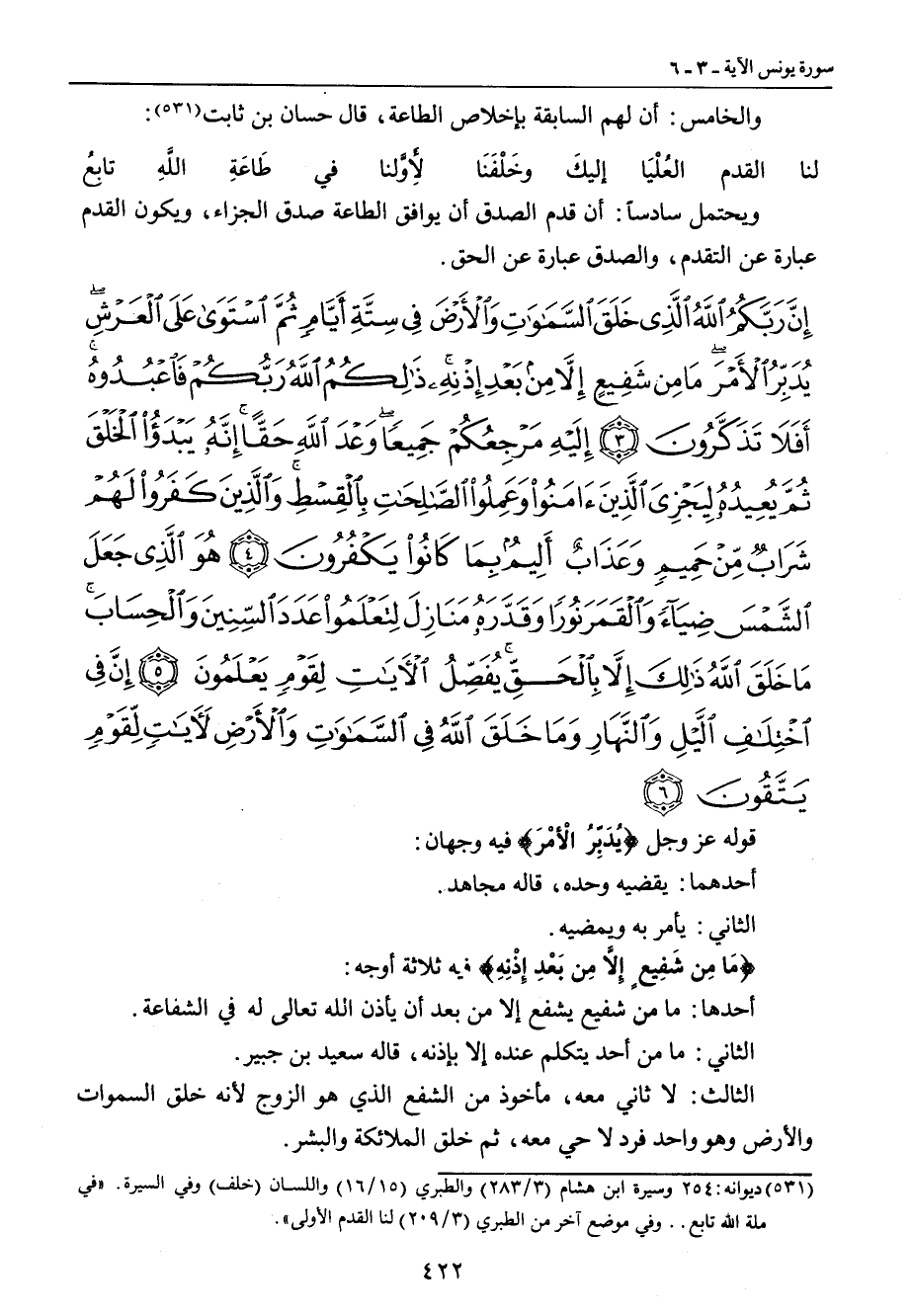 {إن ربكم الله الذي خلق السماوات والأرض في ستة أيام ثم استوى على العرش يدبر الأمر ما من شفيع إلا من بعد إذنه ذلكم الله ربكم فاعبدوه أفلا تذكرون إليه مرجعكم جميعا وعد الله حقا إنه يبدأ الخلق ثم يعيده ليجزي الذين آمنوا وعملوا الصالحات بالقسط والذين كفروا لهم شراب من حميم وعذاب أليم بما كانوا يكفرون هو الذي جعل الشمس ضياء والقمر نورا وقدره منازل لتعلموا عدد السنين والحساب ما خلق الله ذلك إلا بالحق يفصل الآيات لقوم يعلمون إن في اختلاف الليل والنهار وما خلق الله في السماوات والأرض لآيات لقوم يتقون} قوله عز وجل: {يُدَبِّرُ الأمْرَ} فيه وجهان: أحدهما: يقضيه وحده , قاله مجاهد. الثاني: يأمر به ويمضيه. {مَا مِن شَفِيعٍ إِلاَّ مِن بَعْدِ إِذْنِهِ} فيه ثلاثة أوجه: أحدها: ما من شفيع يشفع إلا من بعد أن يأذن الله تعالى له في الشفاعة. الثاني: ما من أحد يتكلم عنده إلا بإذنه , قاله سعيد بن جبير. الثالث: لا ثاني معه , مأخوذ من الشفع الذي هو الزوج لأنه خلق السموات والأرض وهو واحد فرد لا حي معه , ثم خلق الملائكة والبشر.