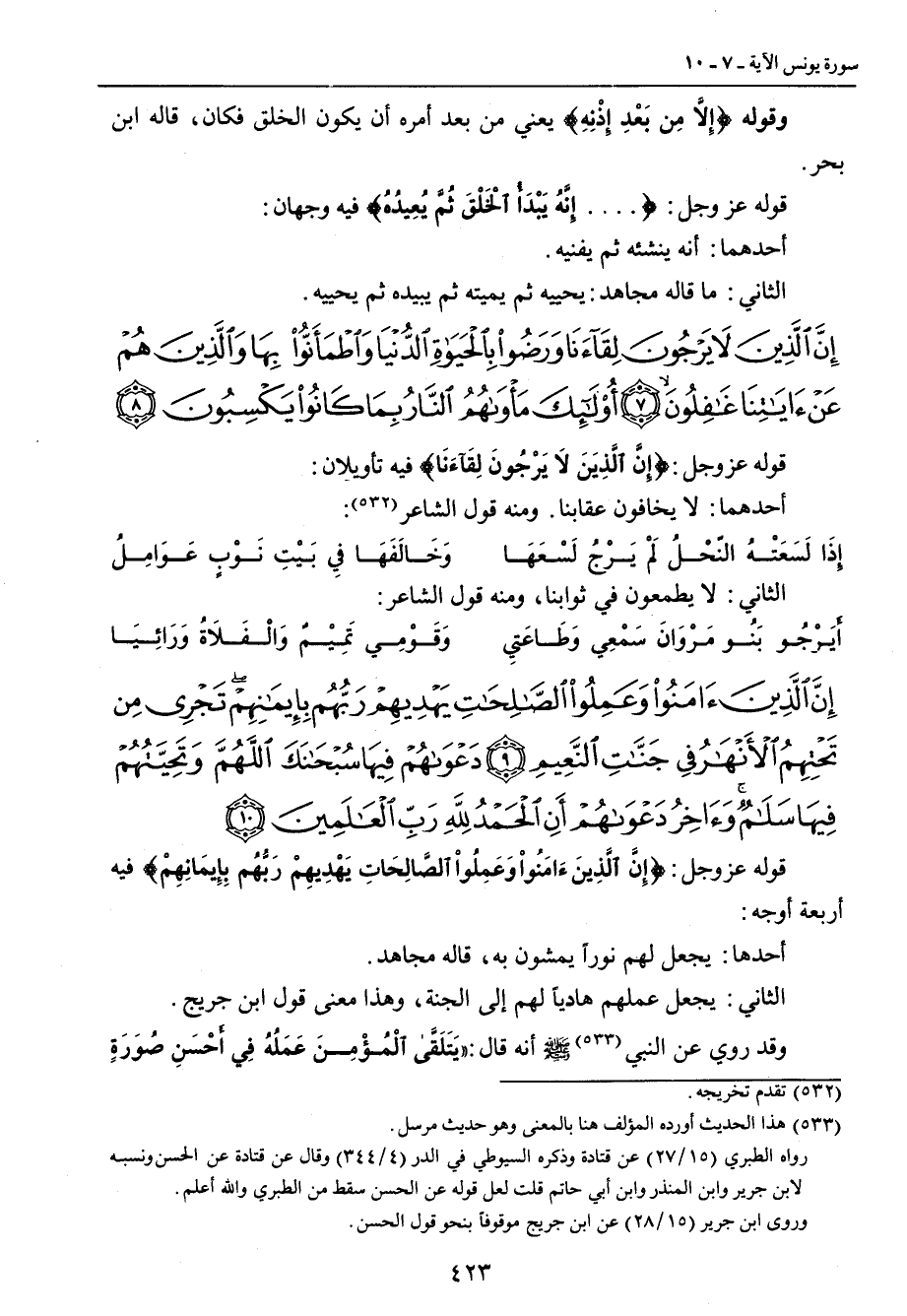 {إن الذين آمنوا وعملوا الصالحات يهديهم ربهم بإيمانهم تجري من تحتهم الأنهار في جنات النعيم دعواهم فيها سبحانك اللهم وتحيتهم فيها سلام وآخر دعواهم أن الحمد لله رب العالمين} قوله عز وجل: {إِنَّ الَّذِينَءَامَنُواْ وَعَمِلُواْ الصَّالِحَاتِ يَهْدِيهِمْ رَبُّهُم بإِيمَانِهِمْ} فيه أربعة أوجه: أحدها: يجعل لهم نوراً يمشون به , قاله مجاهد. الثاني: يجعل عملهم هادياً لهم إلى الجنة , وهذا معنى قول ابن جريج. وقد روي عن النبي صلى الله عليه وسلم أنه قال: (يَتَلَقَّى الْمُؤْمِنَ عَمَلُهُ فِي أَحْسَنِ صُوَرَةٍ