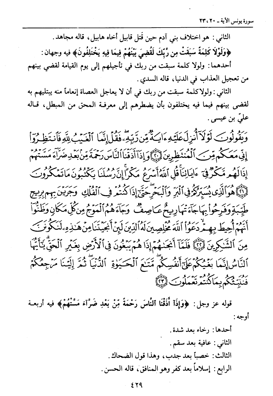 الثاني: هو اختلاف بني بن آدم حين قَتل قابيل أخاه هابيل , قاله مجاهد. {وَلَوْلاَ كَلِمَةٌ سَبَقَتْ مِن رَّبِّكَ لَقُضِيَ بَيْنَهُمْ فِيمَا فِيهِ يَخْتَلِفُونَ} فيه وجهان: أحدهما: ولولا كلمة سبقت من ربك في تأجيلهم إلى يوم القيامة لقضي بينهم من تعجيل العذاب في الدنيا , قاله السدي. الثاني: ولولا كلمة سبقت من ربك في أن لا يعاجل العصاة إنعاماً منه يبتليهم به لقضى بينهم فيما فيه يختلفون بأن يضطرهم إلى معرفة المحق من المبطل , قاله عليّ بن عيسى.