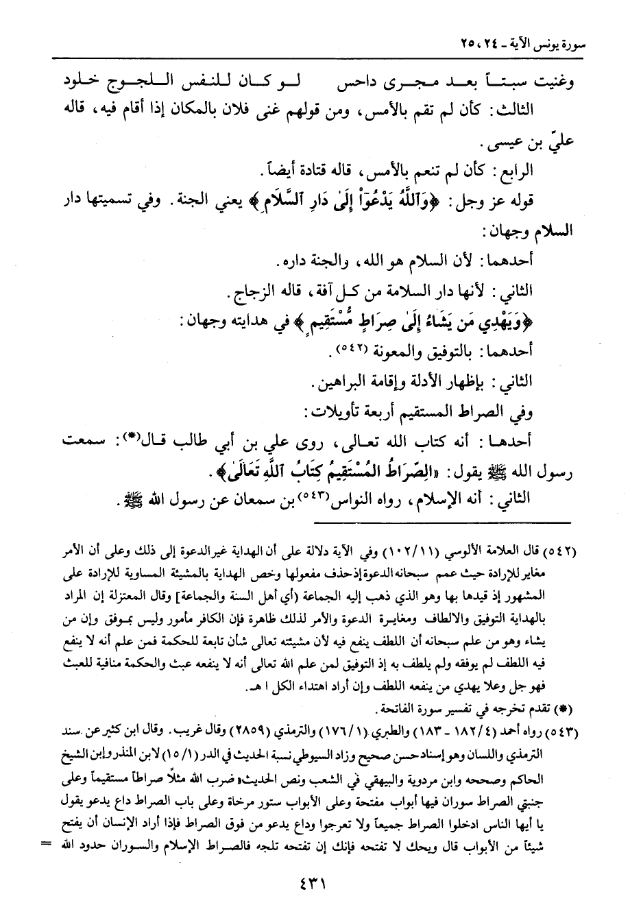 الثالث: كأن لم تقم بالأمس , ومن قولهم غنى فلان بالمكان إذا أقام فيه , قاله عليّ بن عيسى. الرابع كأن لم تنعم بالأمس , قاله قتادة أيضاً. قوله عز وجل: {وَاللَّهَ يَدُعُواْ إِلَى دَارِ السَّلاَمِ} يعني الجنة. وفي تسميتها دار السلام وجهان: أحدهما: لأن السلام هو الله , والجنة داره. الثاني: لأنها دار السلامة من كل آفة , قاله الزجاج. {وَيَهْدِي مَن يَشَاءُ إِلَى صِرَاطٍ مُسْتَقِيمٍ} في هدايته وجهان: أحدهما: بالتوفيق والمعونة. الثاني: بإظهار الأدلة وإقامة البراهين. وفي الصراط المستقيم أربعة تأويلات: أحدها: أنه كتاب الله تعالى , روى علي بن أبي طالب قال: سمعت رسول الله صلى الله عليه وسلم يقول: (الصِّرَاطُ المُسْتَقِيمُ كِتَابُ اللَّهِ تَعَالَى). الثاني: أنه الإسلام , رواه النواس بن سمعان عن رسول الله صلى الله عليه وسلم.