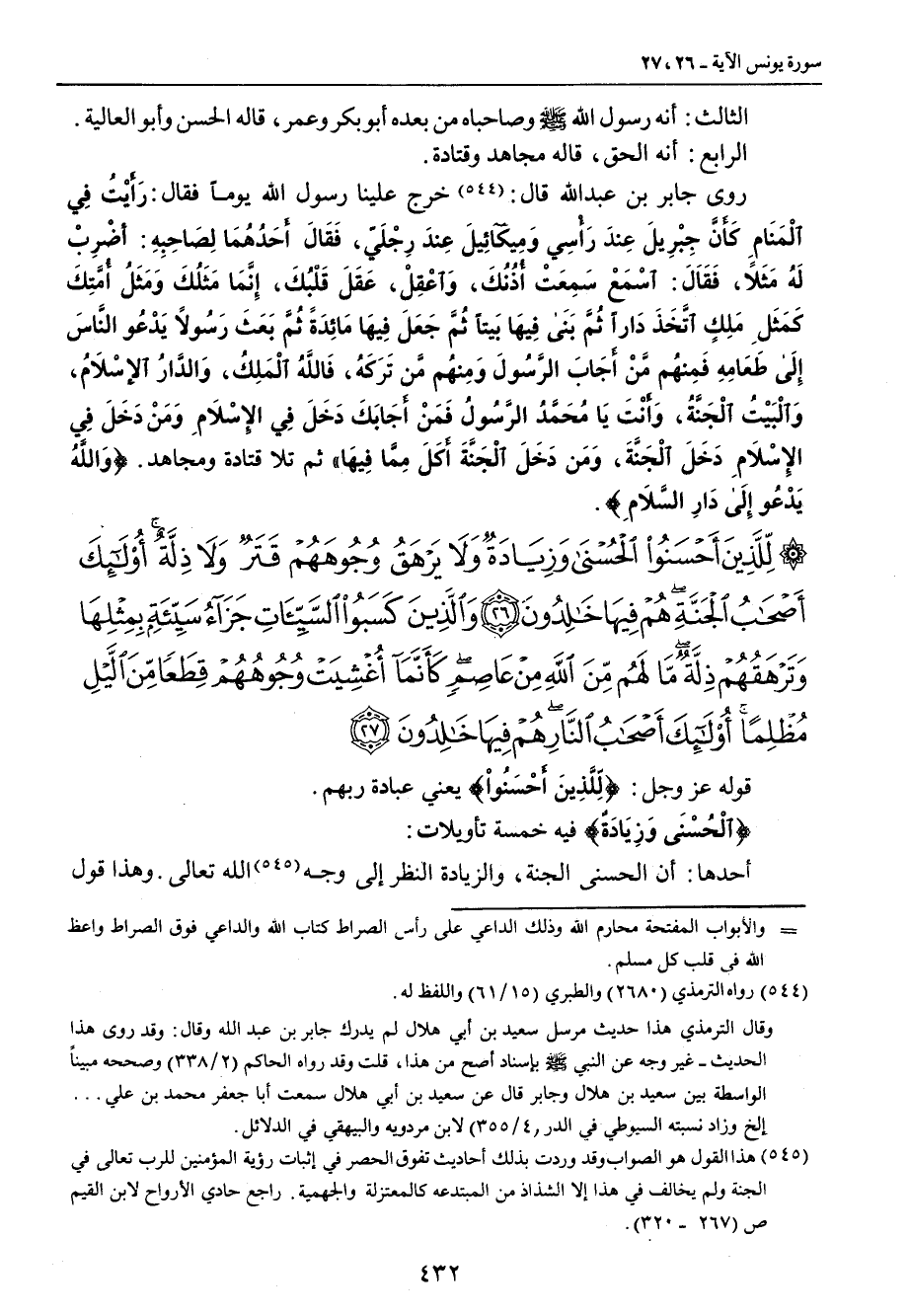 الثالث: أنه رسول الله صلى الله عليه وسلم وصاحباه من بعده أبو بكر وعمر , قاله الحسن وأبو العالية. الرابع: أنه الحق , قاله مجاهد وقتادة. روى جابر بن عبد الله قال: خرج علينا رسول الله يوماً فقال: (رَأيْتُ فِي الْمَنَامِ كَأَنَّ جِبْرِيلَ عِندَ رَأْسِي وَمِيكآئِيلَ عِندَ رِجْلَيّ , فَقَالَ أَحَدُهُمَا لِصَاحِبهِ: أضْرِبْ لَهُ مَثَلاً , فَقَالَ: اسْمَعْ سَمْعَتْ أُذُنُكَ , وَاعْقِلْ , عَقَلَ قَلْبُكَ , إِنَّمَا مَثَلُكَ وَمَثَلُ أُمَّتِكَ كَمَثَلِ مَلِكٍ أتَّخَذَ دَاراً ثُمَّ بَنَى فِيهَا بَيتاً ثُمَّ جَعَلَ فِيهَا مَائِدَةً ثُمَّ بَعَثَ رَسُولاً يَدْعُو النَّاسَ إِلَى طَعَامِهِ فَمِنهُم مَّنْ أَجَابَ الرَّسُولَ وَمِنهُم مَّن تَرَكَهُ , فَاللَّهُ الْمَلِكُ , وَالدَّارُ الإسْلاَمُ , وَالْبَيْتُ الْجَنَّةُ , وََأَنْتَ يَا مُحَمَّدُ الرَّسُولُ فَمَنْ أَجَابَكَ دَخَلَ فِي الإِسْلاَمِ , وَمَنْ دَخَلَ فِي الإِسْلاَمِ دَخَلَ الْجَنَّةَ , وَمَن دَخَلَ الْجَنَّةَ أَكَلَ مِمَّا فيهَا) ثم تلا قتادة ومجاهد. {وَاللَّهُ يَدْعُوا إِلَى دَارِ السَّلاَمِ}.
