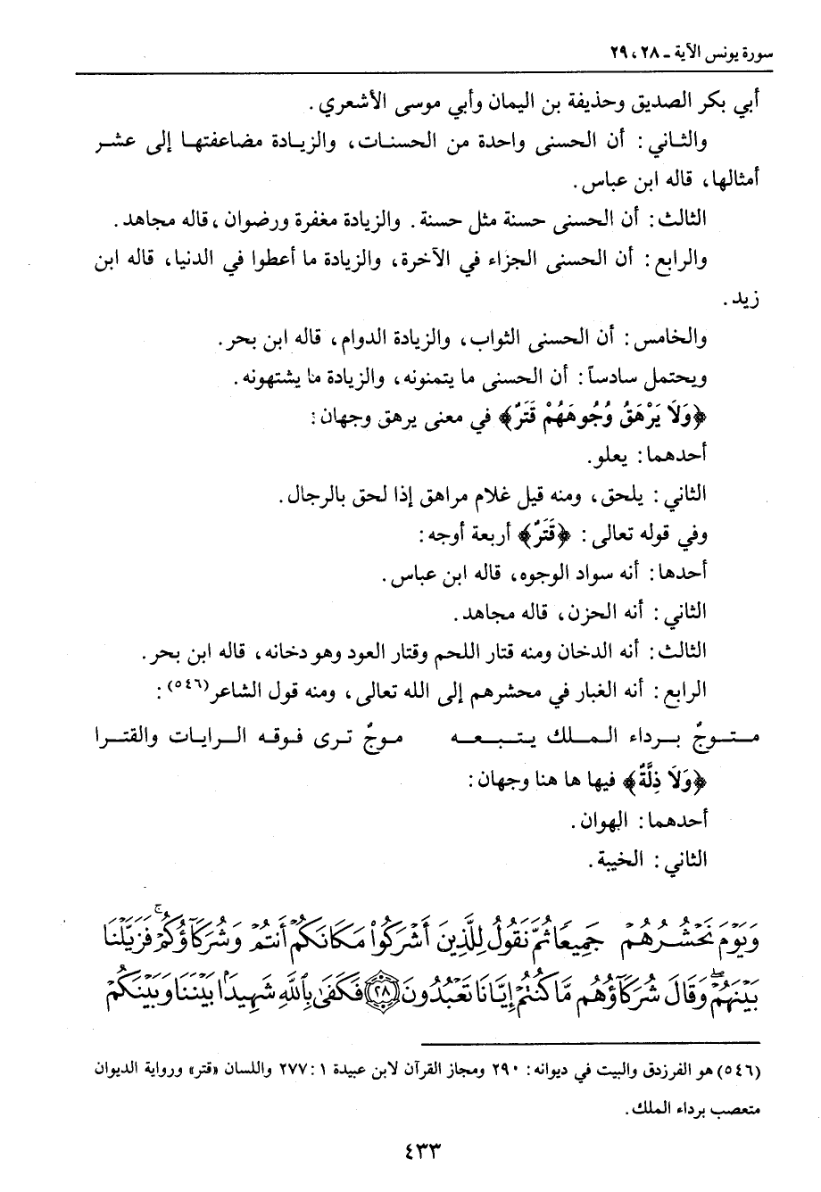 أبي بكر الصديق وحذيفة بن اليمان وأبي موسى الأشعري. والثاني: أن الحسنى واحدة من الحسنات , والزيادة مضاعفتها إلى عشر أمثالها , قاله ابن عباس. الثالث: أن الحسنى حسنة مثل حسنة. والزيادة مغفرة ورضوان , قاله مجاهد. والرابع: أن الحسنى الجزاء في الآخرة والزيادة ما أعطوا في الدنيا , قاله ابن زيد. والخامس: أن الحسنى الثواب , والزيادة الدوام , قاله ابن بحر. ويحتمل سادساً: أن الحسنى ما يتمنونه , والزيادة ما يشتهونه. {وَلاَ يَْرهَقُ وَجُوهَهُمْ قَتَرٌ} في معنى يرهق وجهان: أحدهما: يعلو. الثاني: يلحق , ومنه قيل غلام مراهق إذا لحق بالرجال. وفي قوله تعالى: {قَتَرٌ} أربعة أوجه: أحدها: أنه سواد الوجوه , قاله ابن عباس. الثاني: أنه الحزن , قاله مجاهد. الثالث: أنه الدخان ومنه قتار اللحم وقتار العود وهو دخانه , قاله ابن بحر. الرابع: أنه الغبار في محشرهم إلى الله تعالى , ومنه قول الشاعر:
