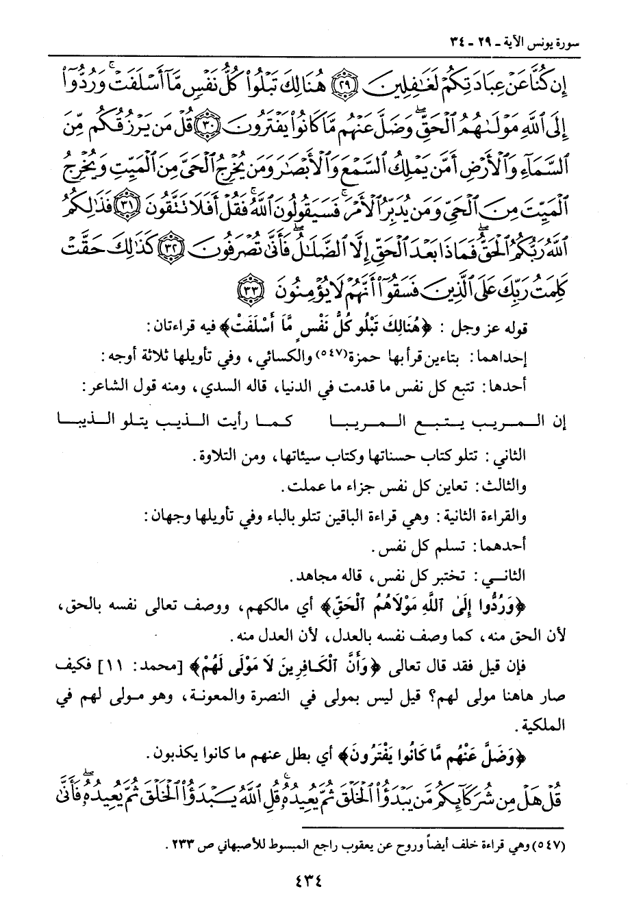 إن كنا عن عبادتكم لغافلين هنالك تبلو كل نفس ما أسلفت وردوا إلى الله مولاهم الحق وضل عنهم ما كانوا يفترون قل من يرزقكم من السماء والأرض أم من يملك السمع والأبصار ومن يخرج الحي من الميت ويخرج الميت من الحي ومن يدبر الأمر فسيقولون الله فقل أفلا تتقون فذلكم الله ربكم الحق فماذا بعد الحق إلا الضلال فأنى تصرفون كذلك حقت كلمة ربك على الذين فسقوا أنهم لا يؤمنون} قوله عز وجل: {هُنَالِكَ تَبْلُواْ كُلُّ نَفْسٍ مَّآ أَسْلَفَتْ} فيه قراءتان: إحداهما: بتاءين قرأ بها حمزة والكسائي , وفي تأويلها ثلاثة أوجه: أحدها: تتبع كل نفس ما قدمت في الدنيا , قاله السدي , ومنه قول الشاعر:
