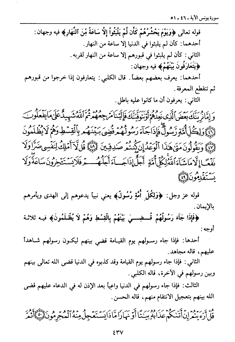 قوله تعالى {وَيَوْمَ يَحْشُرُهُمْ كَأَنَ لَّمْ يَلْبَثُواْ إِلاَّ سَاعَةً مِّنَ النَّهَارِ} فيه وجهان: أحدهما: كأن لم يلبثوا في الدنيا إلا ساعة من النهار. الثاني: كأن لم يلبثوا في قبورهم إلا ساعة من النهار لقربه. {يَتَعَارَفُونَ بَيْنَهُمْ} فيه وجهان: أحدهما: يعرف بعضهم بعضاً. قال الكلبي: يتعارفون إذا خرجوا من قبورهم ثم تنقطع المعرفة. الثاني: يعرفون أن ما كانوا عليه باطل.