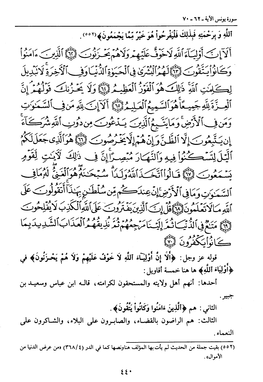 {ألا إن أولياء الله لا خوف عليهم ولا هم يحزنون الذين آمنوا وكانوا يتقون لهم البشرى في الحياة الدنيا وفي الآخرة لا تبديل لكلمات الله ذلك هو الفوز العظيم ولا يحزنك قولهم إن العزة لله جميعا هو السميع العليم ألا إن لله من في السماوات ومن في الأرض وما يتبع الذين يدعون من دون الله شركاء إن يتبعون إلا الظن وإن هم إلا يخرصون هو الذي جعل لكم الليل لتسكنوا فيه والنهار مبصرا إن في ذلك لآيات لقوم يسمعون قالوا اتخذ الله ولدا سبحانه هو الغني له ما في السماوات وما في الأرض إن عندكم من سلطان بهذا أتقولون على الله ما لا تعلمون قل إن الذين يفترون على الله الكذب لا يفلحون متاع في الدنيا ثم إلينا مرجعهم ثم نذيقهم العذاب الشديد بما كانوا يكفرون} قوله عز وجل: {أَلاَّ إِنَّ أَوْلِيَآءَ اللَّهِ لاَ خَوْفٌ عَلَيْهِمْ وَلاَ هُمْ يَحْزَنُونَ} في {أَوْلِيَاءَ اللَّهِ} ها هنا خمسة أقاويل: أحدها: أنهم أهل ولايته والمستحقون لكرامته , قاله ابن عباس وسعيد بن جبير. الثاني: هم {الَّذِينَءَامَنُوا وَكَانُواْ يَتَّقُونَ}. الثالث: هم الراضون بالقضاء , والصابرون على البلاء , والشاكرون على النعماء.