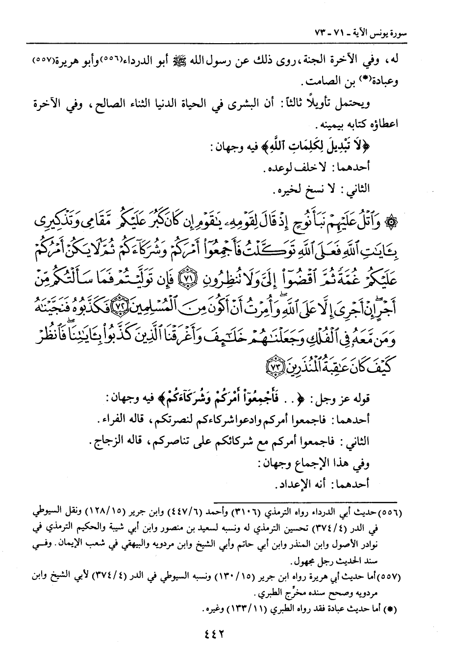 {واتل عليهم نبأ نوح إذ قال لقومه يا قوم إن كان كبر عليكم مقامي وتذكيري بآيات الله فعلى الله توكلت فأجمعوا أمركم وشركاءكم ثم لا يكن أمركم عليكم غمة ثم اقضوا إلي ولا تنظرون فإن توليتم فما سألتكم من أجر إن أجري إلا على الله وأمرت أن أكون من المسلمين فكذبوه فنجيناه ومن معه في الفلك وجعلناهم خلائف وأغرقنا الذين كذبوا بآياتنا فانظر كيف كان عاقبة المنذرين} قوله عز وجل: { ... فَأَجْمِعُواْ أَمْرَكُمْ وَشُرَكآءَكُمْ} فيه وجهان: أحدهما: فاجمعوا أمركم وادعوا شركاءكم لنصرتكم , قاله الفراء. الثاني: فاجمعوا أمركم مع شركائكم على تناصركم , قاله الزجاج. وفي هذا الإجماع وجهان: أحدهما: أنه الإعداد.