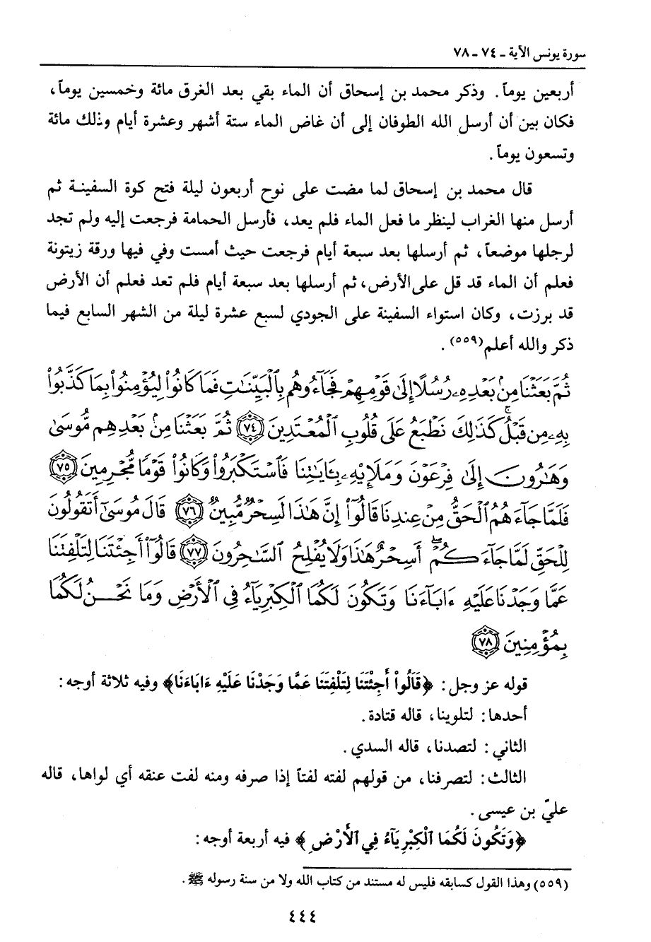 {ثم بعثنا من بعده رسلا إلى قومهم فجاؤوهم بالبينات فما كانوا ليؤمنوا بما كذبوا به من قبل كذلك نطبع على قلوب المعتدين ثم بعثنا من بعدهم موسى وهارون إلى فرعون وملئه بآياتنا فاستكبروا وكانوا قوما مجرمين فلما جاءهم الحق من عندنا قالوا إن هذا لسحر مبين قال موسى أتقولون للحق لما جاءكم أسحر هذا ولا يفلح الساحرون قالوا أجئتنا لتلفتنا عما وجدنا عليه آباءنا وتكون لكما الكبرياء في الأرض وما نحن لكما بمؤمنين} قوله عز وجل: {قَالُواْ أَجِئْتَنَا لِتَلْفِتَنَا عَمَّا وَجَدْنَا عَلَيْهِءَابَاءَنَا} وفيه ثلاثة أوجه: أحدها: لتلوينا , قاله قتادة. الثاني: لتصدنا , قاله السدي. الثالث: لتصرفنا , من قولهم لفته لفتاً إذا صرفه ومنه لفت عنقه أي لواها , قاله عليّ بن عيسى. {وَتَكُونَ لَكُمَا الْكِبْرِيَآءُ فِي الأَرْضِ} فيه أربعة أوجه: