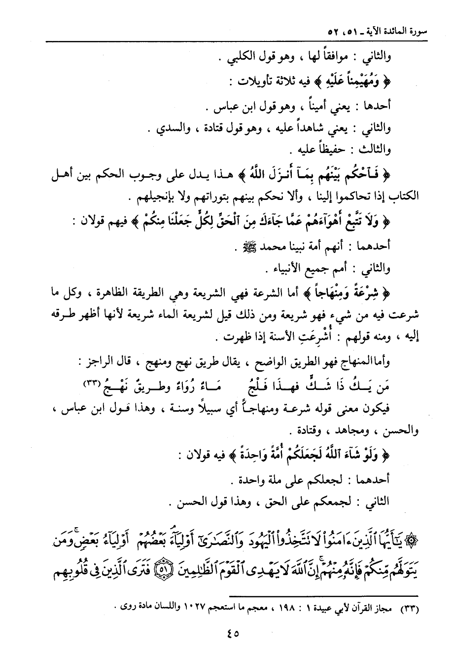 فيكون معنى قوله شرعة ومنهاجاً أي سبيلاً وسنة , وهذا قول ابن عباس , والحسن , ومجاهد , وقتادة. {وَلَوْ شَآءَ اللَّهُ لَجَعَلَكُمْ أُمَّةً وَاحِدةً} فيه قولان: أحدهما: لجعلكم على ملة واحدة. الثاني: لجمعكم على الحق , وهذا قول الحسن.