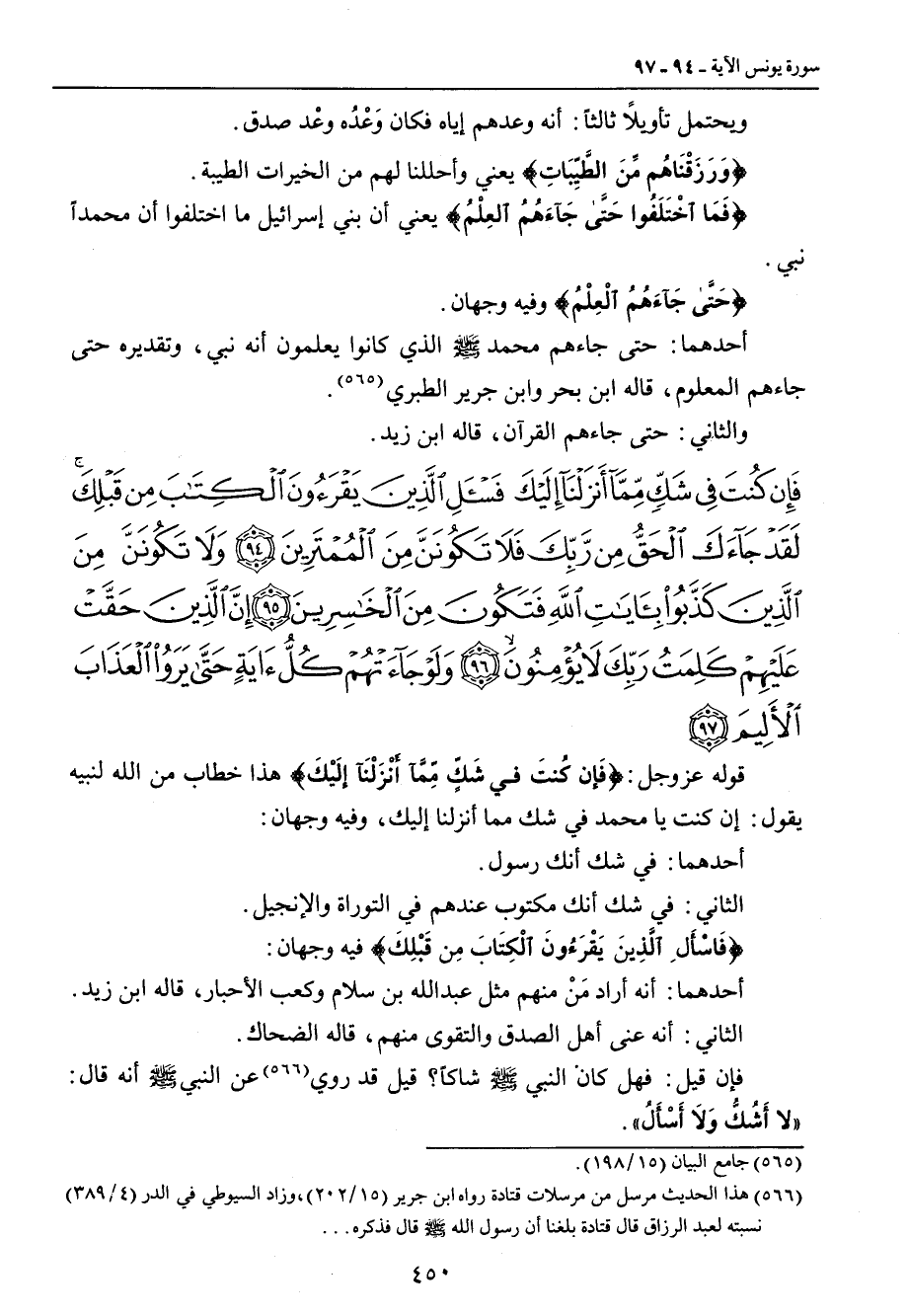 {فإن كنت في شك مما أنزلنا إليك فاسأل الذين يقرؤون الكتاب من قبلك لقد جاءك الحق من ربك فلا تكونن من الممترين ولا تكونن من الذين كذبوا بآيات الله فتكون من الخاسرين إن الذين حقت عليهم كلمة ربك لا يؤمنون ولو جاءتهم كل آية حتى يروا العذاب الأليم} قوله عز وجل: {فَإن كُنتَ في شَكٍّ مِّمَّآ أَنْزَلْنَآ إِلَيْكَ} هذا خطاب من الله لنبيه يقول: إن كنت يا محمد في شك مما أنزلنا إليك , وفيه وجهان: أحدهما: في شك أنك رسول. الثاني: في شك أنك مكتوب عندهم في التوراة والإنجيل. {فَاسْأَلِ الَّذِينَ يَقْرَءُونَ الْكَتَابَ مِن قَبْلِكَ} فيه وجهان: أحدهما: أنه أراد مَنْ منهم مثل عبد الله بن سلام وكعب الأحبار , قاله ابن زيد. الثاني: أنه عنى أهل الصدق والتقوى منهم , قاله الضحاك. فإن قيل: فهل كان النبي صلى الله عليه وسلم شاكاً؟ قيل قد روي عن النبي صلى الله عليه وسلم أنه قال: (لاَ أَشُكُ وَلاَ أَسْأَلُ)