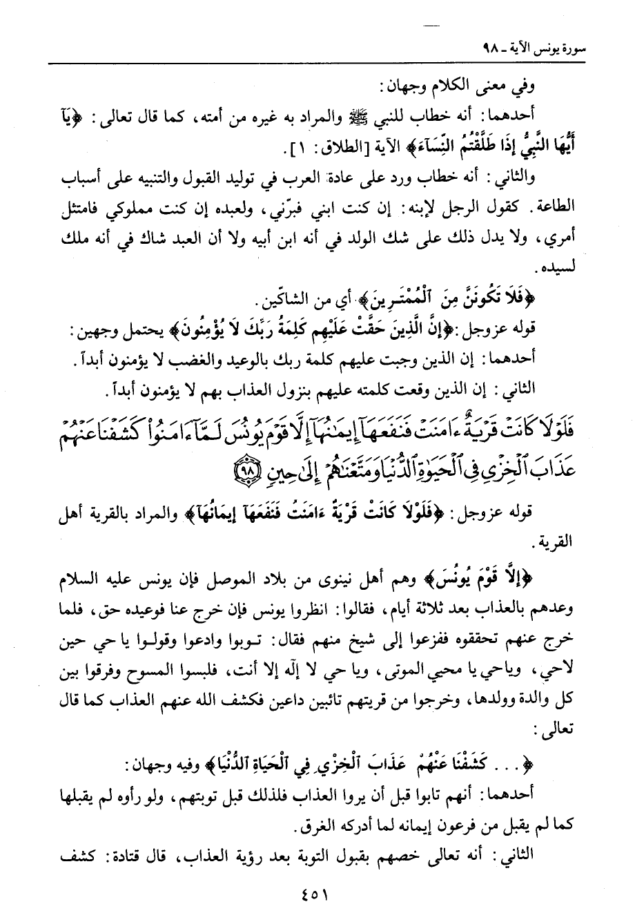 {فلولا كانت قرية آمنت فنفعها إيمانها إلا قوم يونس لما آمنوا كشفنا عنهم عذاب الخزي في الحياة الدنيا ومتعناهم إلى حين} قوله عز وجل: {فَلَوْلاَ كَانَتْ قَرْيَةٌءَامَنَتُ فَنَفَعَهآ إيمَانُهَا} والمراد بالقرية أهل القرية. {إلاَّ قَوْمَ يُونُسَ} وهم أهل نينوى من بلاد الموصل فإن يونس عليه السلام وعدهم بالعذاب بعد ثلاثة أيام , فقالوا: انظروا يونس فإن خرج عنا فوعيده حق , فلما خرج عنهم تحققوه ففزعوا إلى شيخ منهم فقال: توبوا وادعوا وقولوا يا حي حين لاحي , ويا حي يا محيي الموتى , ويا حي لا إله إلا أنت , فلبسوا المسوح وفرقوا بين كل والدة وولدها , وخرجوا من قريتهم تائبين داعين فكشف الله عنهم العذاب كما قال تعالى: { ... كَشَفْنَا عَنْهُمْ عَذَابَ الْخِزْيِ فِي الْحَيَاةِ الدُّنْيَا} وفيه وجهان: أحدهما: أنهم تابوا قبل أن يروا العذاب فلذلك قبل توبتهم , ولو رأوه لم يقبلها كما لم يقبل من فرعون إيمانه لما أدركه الغرق. الثاني: أنه تعالى خصهم بقبول التوبة بعد رؤية العذاب , قال قتادة: كشف