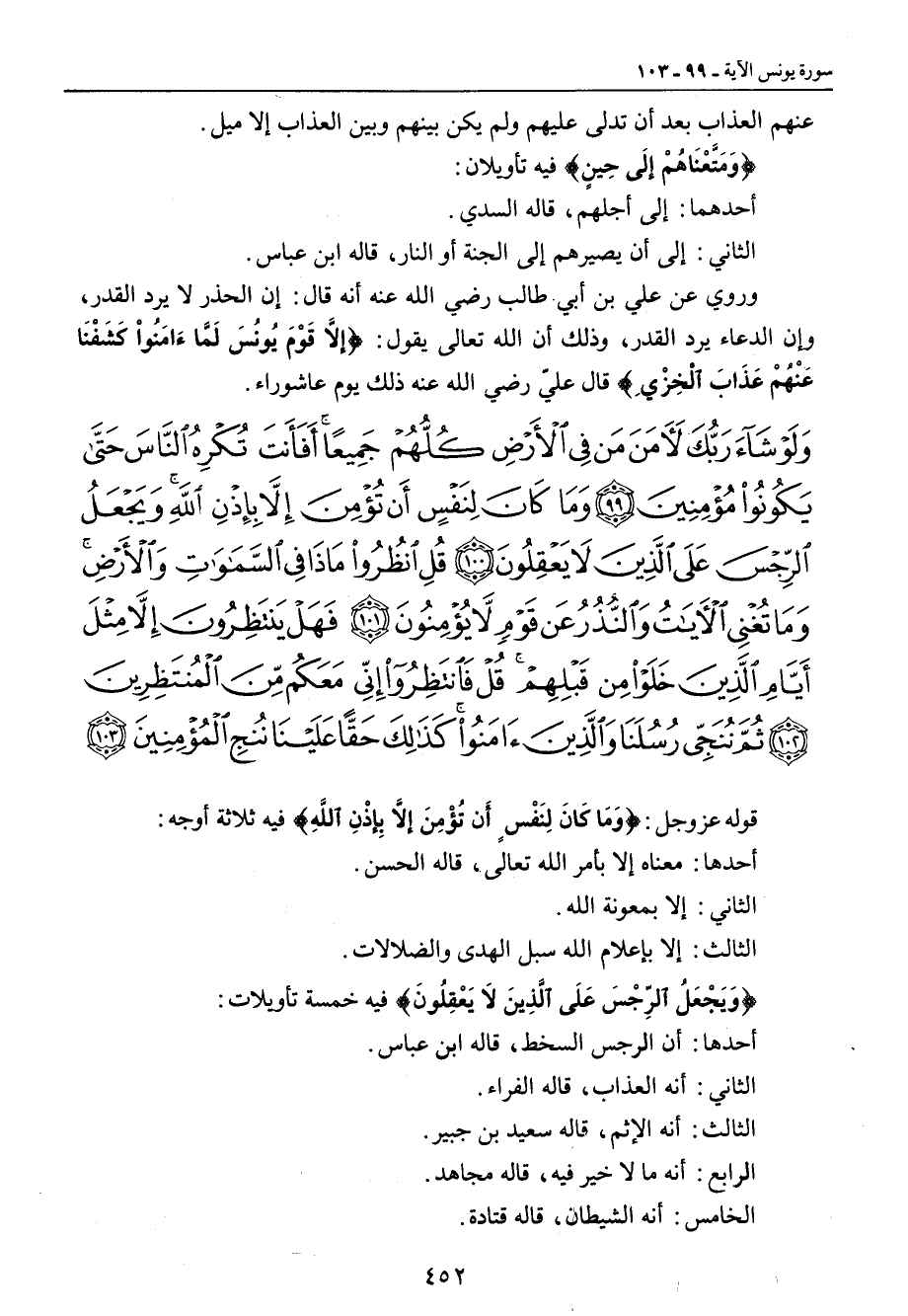 {ولو شاء ربك لآمن من في الأرض كلهم جميعا أفأنت تكره الناس حتى يكونوا مؤمنين وما كان لنفس أن تؤمن إلا بإذن الله ويجعل الرجس على الذين لا يعقلون قل انظروا ماذا في السماوات والأرض وما تغني الآيات والنذر عن قوم لا يؤمنون فهل ينتظرون إلا مثل أيام الذين خلوا من قبلهم قل فانتظروا إني معكم من المنتظرين ثم ننجي رسلنا والذين آمنوا كذلك حقا علينا ننج المؤمنين} قوله عز وجل: {وَمَا كَانَ لِنَفْسٍ أَن تُؤْمِنَ إِلاَّ بِإِذْنِ اللَّهِ} فيه ثلاثة أوجه: أحدها: معناه إلا بأمر الله تعالى , قاله الحسن. الثاني: إلا بمعونة الله. الثالث: إلا بإعلام الله سبل الهدى والضلالات. {وَيَجْعَلُ الرِّجْسَ عَلَى الَّذِينَ لاَ يَعْقِلُونَ} فيه خمسة تأويلات: أحدها: أن الرجس السخط , قاله ابن عباس. الثاني: أنه العذاب , قاله الفراء. الثالث: أنه الإثم , قاله سعيد بن جبيرٍ. الرابع: أنه ما لا خير فيه , قاله مجاهد. الخامس: أنه الشيطان , قاله قتادة.