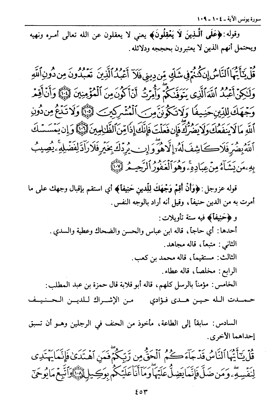 {قل يا أيها الناس إن كنتم في شك من ديني فلا أعبد الذين تعبدون من دون الله ولكن أعبد الله الذي يتوفاكم وأمرت أن أكون من المؤمنين وأن أقم وجهك للدين حنيفا ولا تكونن من المشركين ولا تدع من دون الله ما لا ينفعك ولا يضرك فإن فعلت فإنك إذا من الظالمين وإن يمسسك الله بضر فلا كاشف له إلا هو وإن يردك بخير فلا راد لفضله يصيب به من يشاء من عباده وهو الغفور الرحيم} قوله عز وجل: {وَأَنْ أَقِمْ وَجْهَكَ لِلِّدِينِ حَنِيفاً} أي استقم بإقبال وجهك على ما أمرت به من الدين حنيفاً , وقيل أنه أراد بالوجه النفس. و {حَنِيفاً} فيه ستة تأويلات: أحدها: أي حاجاً , قاله ابن عباس والحسن والضحاك وعطية والسدي. الثاني: متبعاً , قاله مجاهد. الثالث: مستقيماً , قاله محمد بن كعب. الرابع: مخلصاً , قاله عطاء. الخامس: مؤمناً بالرسل كلهم , قاله أبو قلابة قال حمزة بن عبد المطلب: