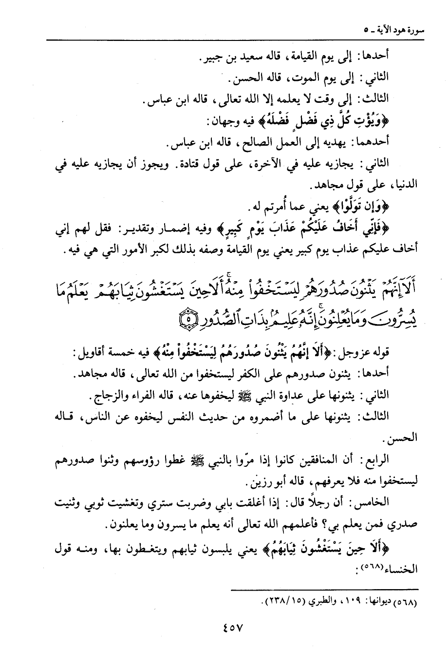 {ألا إنهم يثنون صدورهم ليستخفوا منه ألا حين يستغشون ثيابهم يعلم ما يسرون وما يعلنون إنه عليم بذات الصدور} قوله عز وجل: {أَلاَ إنَّهُمُ يَثْنُونَ صُدُورَهُمْ لِيَسْتَخْفُواْ مِنْهُ} فيه خمسة أقاويل: أحدها: يثنون صدورهم على الكفر ليستخفوا من الله تعالى , قاله مجاهد. الثاني: يثنونها على عداوة النبي صلى الله عليه وسلم ليخفوها عنه , قاله الفراء والزجاج. الثالث: يثنونها على ما أضمروه من حديث النفس ليخفوه عن الناس , قاله الحسن. الرابع: أن المنافقين كانوا إذا مرّوا بالنبي صلى الله عليه وسلم غطوا رؤوسهم وثنوا صدورهم ليستخفوا منه فلا يعرفهم , قاله أبو رزين. الخامس: أن رجلاً قال إذا أغلقت بابي وضربت ستري وتغشيت ثوبي وثنيت صدري فمن يعلم بي؟ فأعلمهم الله تعالى أنه يعلم ما يسرون وما يعلنون. {أَلاَ حِينَ يَسْتَغْشُونَ ثِيَابَهُمُ} يعني يلبسون ثيابهم ويتغطون بها، ومنه قول الخنساء: