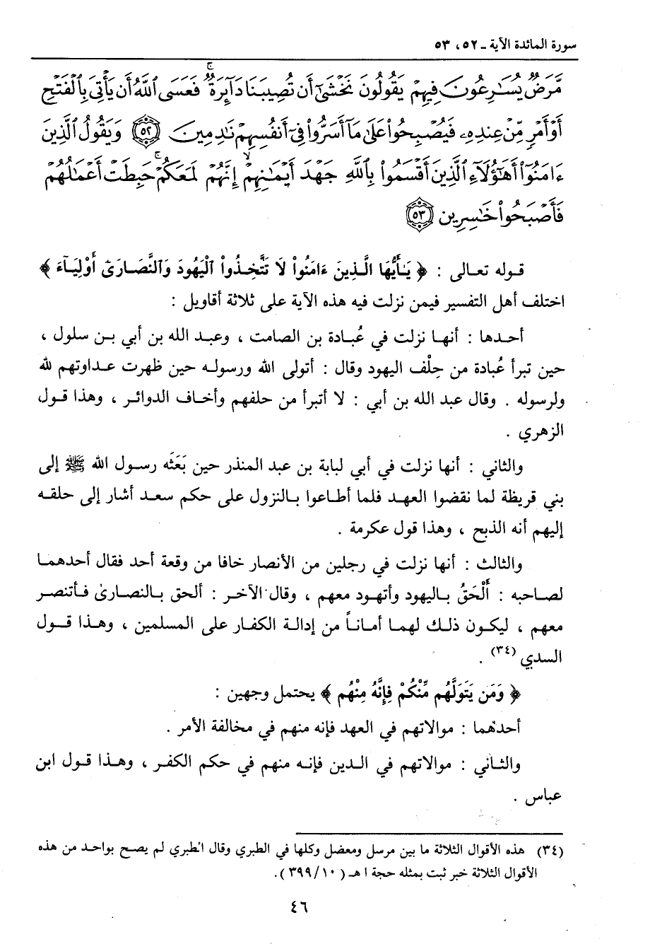 مرض يسارعون فيهم يقولون نخشى أن تصيبنا دائرة فعسى الله أن يأتي بالفتح أو أمر من عنده فيصبحوا على ما أسروا في أنفسهم نادمين ويقول الذين آمنوا أهؤلاء الذين أقسموا بالله جهد أيمانهم إنهم لمعكم حبطت أعمالهم فأصبحوا خاسرين} قوله تعالى: {يَأَيُّهَا الَّذينَءَامُنُوا لاَ تَتَّخِذُواْ الْيَهُودَ وَالنَّصَارَى أَوْلِيآءَ} اختلف أهل التفسير فيمن نزلت فيه هذه الآية على ثلاثة أقاويل: أحدها: أنها نزلت في عُبادة بن الصامت , وعبد بن أبي ابن سلول , حين تبرأ عُبادة من حِلْف اليهود وقال: أتولى الله ورسوله حين ظهرت عداوتهم لله ولرسوله. وقال عبد الله بن أبي: لا أتبرأ من حلفهم وأخف الدوائر , وهذا قول الزهري. والثاني: أنها نزلت فى أبي بلابة بن عبد المنذر حين بَعَثَه رسول الله صلى الله عليه وسلم إلى بني قريظة لما نقضوا العهد أطاعوا بالنزول على حكم سعد أشار إلى حلقه إليهم أنه الذبح , وهذا قول عكرمة. والثالث , أنها نزلت فى رجلين من الأنصار خافا من وقعة أحد فقال أحدهما لصاحبه: أَلْحَقُ باليهود وأتهود معهم , وقال الآخر: ألحق بالنصارى فأتنصر معهم ليكون ذلك لهما أماناً من إدالة الكفار على المسلمين , وهذا قول السدي. {وَمَن يَتَوَلَّهُمْ مِّنْكُمْ فِإِنَّهُ مِنْهُم} يحتمل وجهين: أحدهما: موالاتهم في العهد فإنه منهم في مخالفة الأمر. والثاني: موالاتهم في الدين فإنه منهم في حكم الكفر , وهذا قول ابن عباس.