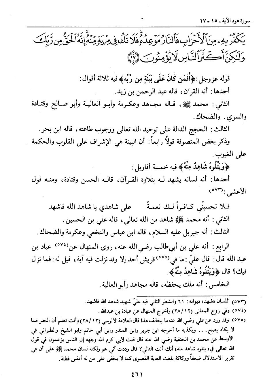 يكفر به من الأحزاب فالنار موعده فلا تك في مرية منه إنه الحق من ربك ولكن أكثر الناس لا يؤمنون} قوله عز وجل: {أَفَمَن كَانَ عَلَى بَيِّنَةٍ مِن رَّبِّه} فيه ثلاثة أقوال: أحدها: أنه القرآن , قاله عبد الرحمن بن زيد. الثاني: محمد صلى الله عليه وسلم , قاله مجاهد وعكرمة وأبو العالية وأبو صالح وقتادة والسري والضحاك. الثالث: الحجج الدالة على توحيد الله تعالى ووجوب طاعته , قاله ابن بحر. وذكر بعض المتصوفة قولاً رابعاً: أن البينة هي الإشراف على القلوب والحكمة على الغيوب. {وَيَتْلُوهُ شَاهِدٌ مِنْهُ} فيه خمسة أقاويل: أحدها: أنه لسانه يشهد له بتلاوة القرآن , قاله الحسن وقتادة , ومنه قول الأعشى: