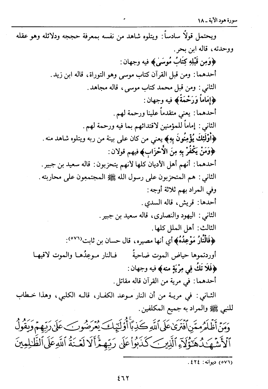 ويحتمل قولاً سادساً: ويتلوه شاهد من نفسه بمعرفة حججه ودلائله وهو عقله ووحدته , قال ابن بحر. {وَمِن قَبْلِهِ كِتَابُ مُوسَى} فيه وجهان: أحدهما: ومن قبل القرآن كتاب موسى وهو التوراة , قاله ابن زيد. الثاني: ومن قبل محمد كتاب موسى , قاله مجاهد. {إِمَاماً وَرَحْمَةًً} فيه وجهان: أحدهما يعني متقدماً علينا ورحمة لهم. الثاني: إماماً للمؤمنين لاقتدائهم بما فيه ورحمة لهم. {أُوْلَئِكَ يُؤْمِنُونَ بِهِ} يعني من كان على بينة من ربه ويتلوه شاهد منه. {وَمَنْ يَكْفُرْ بِهِ مِنَ الأَحْزَابِ} فيهم قولان: أحدهما: أنهم أهل الأديان كلها لأنهم يتحزبون: قاله سعيد بن جبير. الثاني: هم المتخزبون على رسول الله صلى الله عليه وسلم المجتمعون على محاربته. وفي المراد بهم ثلاثة أوجه: أحدها: قريش , قال السدي. الثاني: اليهود والنصارى , قاله سعيد بن جبير. الثالث: أهل الملل كلها. {فَالْنَّارُ مَوْعِدُهُ} أي أنها مصيره , قال حسان بن ثابت: