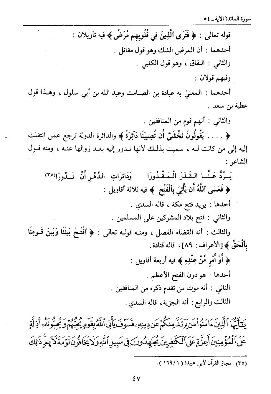 قوله تعالى: {فَتَرَى الَّذِينَ فِي قُلُوبِهِم مَّرَضٌ} فيه تأويلان: أحدهما: أن المرض الشك وهو قول مقاتل. والثاني: النفاق , وهو قول الكلبي. وفيهم قولان: أحدهما: المعنيّ به عبادة بن الصامت وعبد الله بن أبي سلول , وهذا قول عطية بن سعد. والثاني: أنهم قوم من المنافقين. { ... . يَقُولُونَ نَخْشَى أَن تُصِيبَنَا دَآئِرَةٌ} والدائرة ترجع عمن انتقلت إليه إلى من كانت له , سميت بذلك لأنها تدور إليه بعد زوالها عنه , ومنه قول الشاعر: