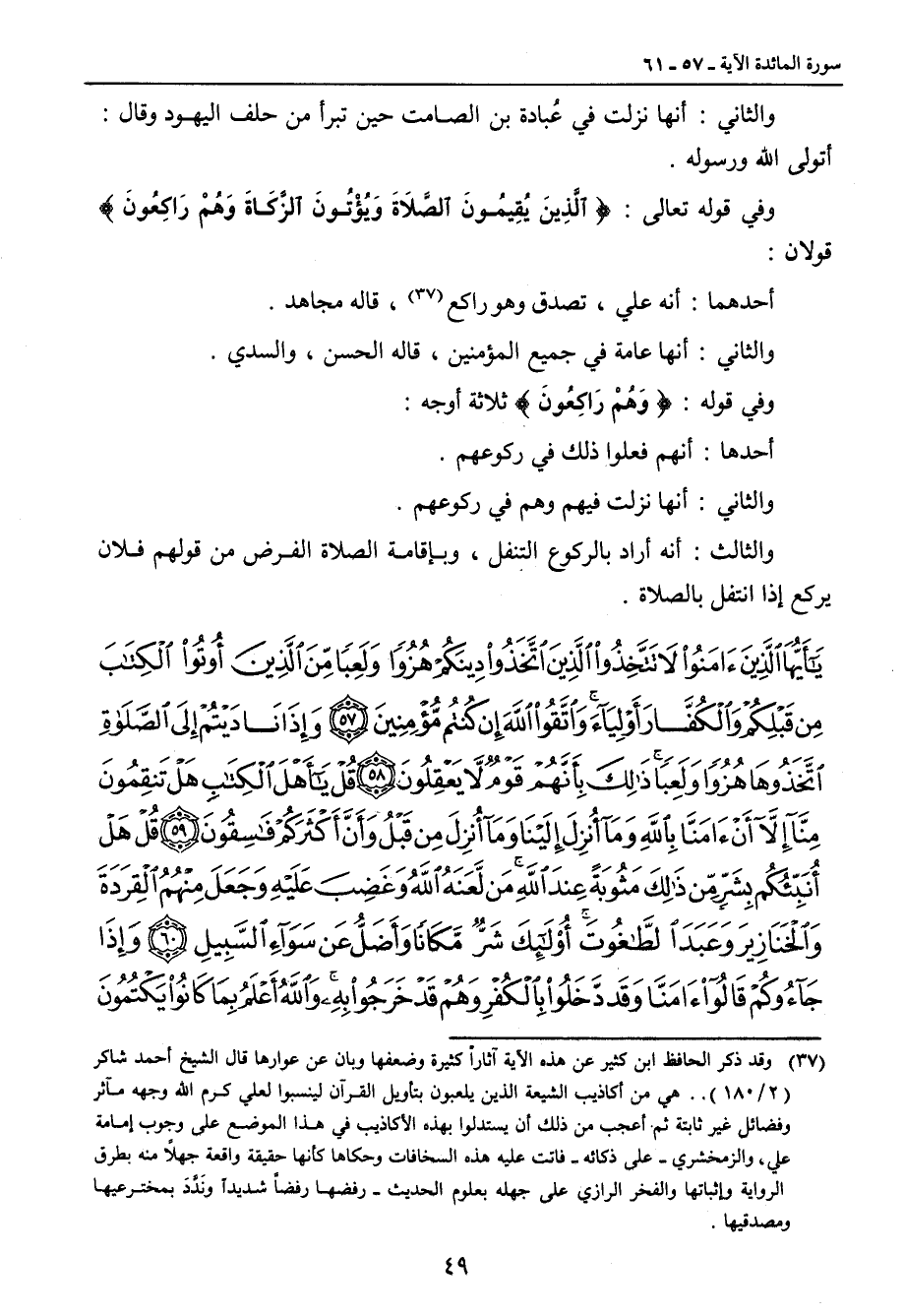 والثاني: أنها نزلت فى عُبادة بن الصامت حين تبرأ من حلف اليهود وقال: أتولى الله ورسوله. وفي قوله تعالى: {الَّذِينَ يُقِيمُونَ الصَّلاَةَ وَيُؤْتُونَ الزَّكَاةَ وَهُمْ رَاكِعُونَ} قولان: أحدهما: أنه علي , تصدق وهو راكع , قاله مجاهد. والثاني: أنها عامة في جميع المؤمنين , قاله الحسن , والسدي. وفي قوله: {وَهُمْ رَاكِعُونَ} ثلاثة أوجه: أحدها: أنهم فعلوا ذلك في ركوعهم. والثاني: أنها نزلت فيهم وهم في ركوعهم. والثالث: أنه أراد بالركوع التنفل , وبإقامة الصلاة الفرض من قولهم فلان يركع إذا انتفل بالصلاة.
