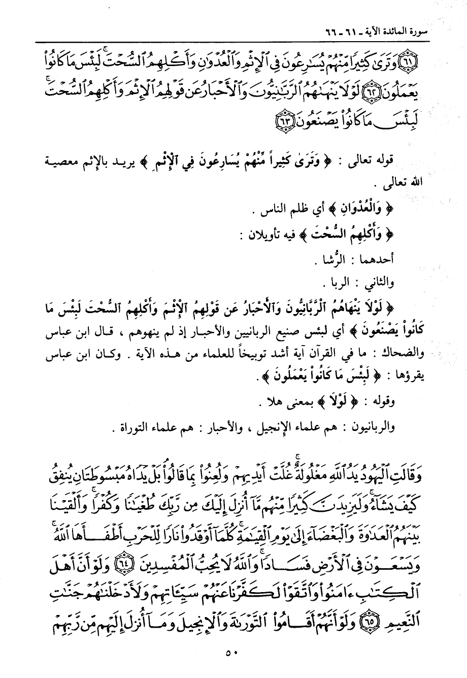 وترى كثيرا منهم يسارعون في الإثم والعدوان وأكلهم السحت لبئس ما كانوا يعملون لولا ينهاهم الربانيون والأحبار عن قولهم الإثم وأكلهم السحت لبئس ما كانوا يصنعون} قوله تعالى: {وَتَرَى كَثِيراً مِّنْهُمْ يُسَارِعُونَ فِي الإِثْمِ} يريد بالإِثم معصية الله تعالى. {وَالْعُدْوَانِ} أي ظلم الناس. {وَأَكْلِهِمُ السُّحْتَ} فيه تأويلان: أحدهما: الرُّشا. والثاني: الربا. {لَوْلاَ يَنْهَاهُمُ الْرَّبَّانِيُّونَ وَالأَحْبَارُ عَن قَوْلِهِمْ الإِثْمَ وَأَكْلِهِمُ السُّحْتَ لَبِئْسَ مَا كَانُواْ يَصْنَعُونَ} أي لبئس صنيع الربانيين والأحبار إذ لم ينهوهم , قال ابن عباس والضحاك: ما في القرآن آية أشد توبيخاً للعلماء من هذه الآية , وكان ابن عباس يقرؤها: {لَبِئْسَ مَا كَانُواْ يَعْمَلُونَ} وقوله: {لَوْلاَ} بمعنى هلا. والربانيون: هم علماء الإِنجيل , والإحبار: هم علماء التوراة.