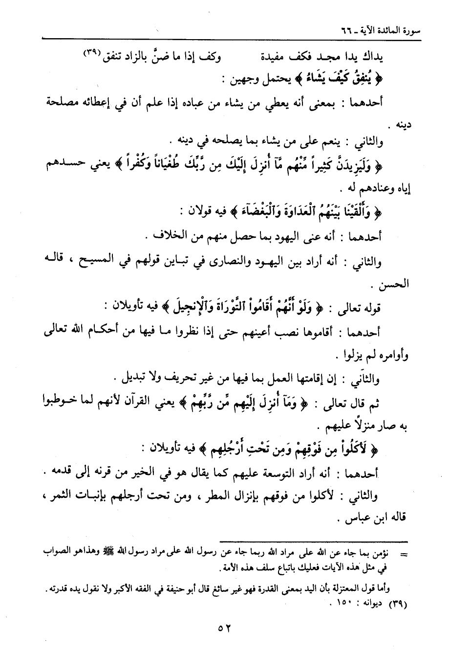{يُنفِقُ كَيْفَ يَشَاءُ} يحتمل وجهين: أحدهما: يمعنى أنه يعطي من يشاء من عباده إذا علم أن في إعطائه مصلحة دينه. والثاني: ينعم على من يشاء بما يصلحة في دينه. {ولَيزِيدَنَّ كَثِيراً مِّنْهُم مَّآ أُنزِلَ إِلَيْكَ مِن رَّبِّكَ طُغْيَاناً وَكُفْراً} يعني حسدهم إياه وعنادهم له. {وَأَلْقَيْنَا بَيْنَهُمُ الْعَدَاوَةَ وَالْبَغْضَآءَ} فيه قولان: أحدهما: أنه عنى اليهود بما حصل منهم من الخلاف. والثاني: أنه أراد بين اليهود والنصارى في تباين قولهم في المسيح , قاله الحسن. قوله تعالى: {وَلَوْ أَنَّهُمْ أَقَامُواْ التَّوْرَاةَ وَالإِنجِيلَ} فيه تأويلان: أحدهما: أقاموها نصب أعينهم حتى إذا نظروا ما فيها من أحكام الله تعالى وأوامره لم يزلوا. والثاني: إن إقامتها العمل بما فيها من غير تحريف ولا تبديل. ثم قال تعالى: {وَمَآ أُنزِلَ إِلَيْهِم مِّن رَّبِّهِمْ} يعني القرآن لأنهم لما خوطبوا به صار منزلاً عليهم. {لأَكَلُواْ مِن فَوْقِهِمْ وَمِن تَحْتِ أَرْجُلِهِم} فيه تأويلان: أحدهما: أنه أراد التوسعة عليهم كما يقال هو في الخير من قرنه إلى قدمه. والثاني: لأكلوا من فوقهم بإنزال المطر , ومن تحت أرجلهم بإنبات الثمر. قاله ابن عباس.