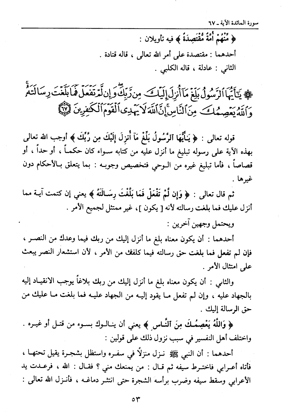 {يا أيها الرسول بلغ ما أنزل إليك من ربك وإن لم تفعل فما بلغت رسالته والله يعصمك من الناس إن الله لا يهدي القوم الكافرين} قوله تعالى: {يَا أَيُّهَا الرَّسُولُ بَلِّغْ مَآ أُنزِلَ إِلَيْكَ مِن رَّبِّكَ} أوجب الله تعالى بهذه الآية على رسوله تبليغ ما أنزل عليه من كتابه سواء كان حكماً , أو حداً , أو قصاصاً , فأما تبليغ غيره من الوحي فتخصيص وجوبه: بما يتعلق بالأحكام دون غيرها. ثم قال تعالى: {وَإِن لَّمْ تَفْعَلْ فَمَا بَلَّغْتَ رِسَالَتَهُ} يعني إن كتمت آية مما أنزل عليك فما بلغت رسالته لأنه [يكون] , غير ممتثل لجميع الأمر. ويحتمل وجهين آخرين. أحدهما: أن يكون معناه بلغ ما انزل إليك من ربك فيما وعدك من النصر , فإن لم تفعل فما بلغت حق رسالته فيما كلفك من الأمر , لأن استشعار النصر يبعث على امتثال الأمر. والثاني: أن يكون معناه بلغ ما أنزل إليك من ربك بلاغاً يوجب الانقياد إليه بالجهاد عليه , وإن لم تفعل ما يقود إليه من الجهاد عليه فما بلغت ما عليك من حق الرسالة إليك. {وَاللَّهُ يَعْصِمُكَ مِنَ النَّاسِ} يعني أن ينالوك بسوء من قتل أو غيره. واختلف أهل التفسير في سبب نزول ذلك على قولين: أحدهما: أن النبي صلى الله عليه وسلم نزل منزلاً في سفره واستظل بشجرة يقيل تحتها , فأتاه أعرابي فاخترط سيفه ثم قال: من يمنعك مني؟ فقال: الله , فرعدت يد الأعرابي وسقط سيفه وضرب برأسه الشجرة حتى انتثر دماغه , فأنزل الله تعالى:
