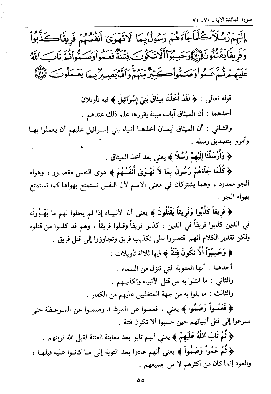 إليهم رسلا كلما جاءهم رسول بما لا تهوى أنفسهم فريقا كذبوا وفريقا يقتلون وحسبوا ألا تكون فتنة فعموا وصموا ثم تاب الله عليهم ثم عموا وصموا كثير منهم والله بصير بما يعملون} قوله تعالى: {لَقَدْ أَخَذْنَا مِيثَاقَ بَنِي إِسْرَائِيلَ} فيه تأويلان: أحدهما أن الميثاق آيات مبينة يقررها علم ذلك عندهم. والثاني: أن الميثاق أيمان أخذه أنبياء بني إسرائيل عليهم أن يعملوا بها وأمروا بتصيدق رسله. {وَأَرْسَلْنَا إِلَيْهِمْ رُسُلاً} يعني بعد أخذ الميثاق. {كُلَّمَا جَآءَهُمْ رَسُولٌ بِمَا لاَ تَهْوَى أَنفُسُهُمْ} هوى النفس مقصور , وهواء الجو ممدود , وهما يشتركان في معنى الاسم لأن النفس تستمتع بهواها كما تستمتع بهواء الجو. {فَرِيقاً كَذَّبُوا وَفَرِيقاً يَقْتُلُونَ} يعني أن الأنبياء إذا لم يحلوا لهم ما يَهْوُونَه في الدين كذبوا فريقاً في الدين , كذبوا فريقاً وقتلوا فريقاً , وهم قد كذبوا من قتلوه ولكن تقدير الكلام أنهم اقتصروا على تكذيب فريق وتجاوزوا إلى قتل فريق. {وَحَسِبُواْ أَلاَّ تَكُونَ فِتْنَةٌ} فيها ثلاثة تأويلات: أحدها: أنها العقوبة التي تنزل من السماء. والثاني: ما ابتلوا به من قتل الأنبياء وتكذيبهم. والثالث: ما بلوا به من جهة المتغلبين عليهم من الكفار. {فَعَمُواْ وَصَمُّوا} يعني , فعموا عن المرشد وصموا عن الموعظة حتى تسرعوا إلى قتل أنبيائهم حين حسبوا ألا تكون فتنة. {ثُمَّ تَابَ اللَّهُ عَلَيْهِمْ} يعني أنهم تابوا بعد معاينة الفتنة فقبل الله توبتهم. {ثُمَّ عَمُواْ وَصَمُّواْ} يعني أنهم عادوا بعد التوبة إلى ما كانوا عليه قبلها , والعود إنما كان من أكثرهم لا من جميعهم.
