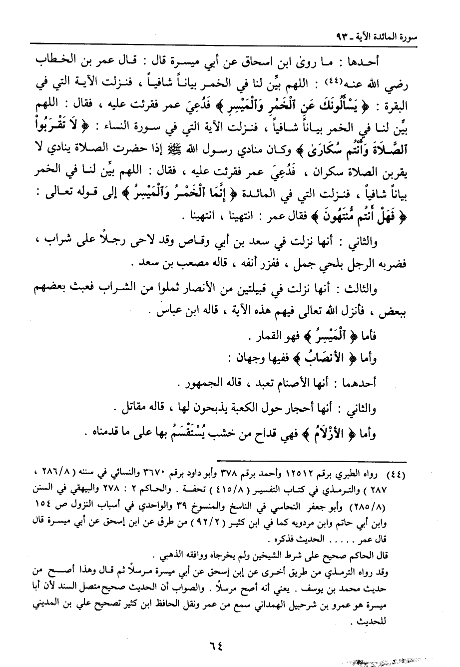 أحدها: ما روى ابن إسحاق عن أبي ميسرة قال: قال عمر بن الخطاب رضي الله عنه: اللهم بيِّن لنا في الخمر بياناً شافياً , فزلت الآية التي في البقرة: {يَسْأَلُونَكَ عَنِ الْخَمْرِ وَالْمَيْسِرِ} فَدُعِيَ عمر فقرئت عليه , فقال: اللهم بيِّن لنا في الخمر بياناً شافياً , فنزلت الآية التي في سورة النساء: {لاَ تَقْرَبُواْ الصَّلاَةَ وَأَنْتُم سُكَارَى} وكان منادي رسول الله صلى الله عليه وسلم إذا حضرت الصلاة ينادي لا يقربن الصلاة سكران , فَدُعِيَ عمر فقرئت عليه , فقال: اللهم بيِّن لنا في الخمر بياناً شافياً , فنزلت التي في المائدة {إِنَّمَا الْخَمْرُ وَالْمَيْسِرُ} إلى قوله تعالى: {فَهَلْ أَنتُم مُّنتَهُونَ} فقال عمر: انتهينا , انتهينا. والثاني: أنها نزلت في سعد بن أبي وقاص وقد لاحى رجلاً على شراب , فضربه الرجل بلحي جمل , ففزر قاله مصعب بن سعد. والثالث: أنها نزلت في قبيلتين من الأنصار ثملوا من الشراب فعبث بعضهم ببعض , فأنزل الله تعالى فيهم هذه الآية , قاله ابن عباس. فأما {الْمَيْسِرُ} فهو القمار. وأما {الأنصَابُ} ففيها وجهان. أحدهما: أنها الأصنام تعبد , قاله الجمهور. والثاني: أنها أحجار حول الكعبة يذبحون لها , قاله مقاتل. وأما {الأَزْلاَمُ} فهي قداح من خشب يُسْتَقْسَمُ بها على ما قدمناه.