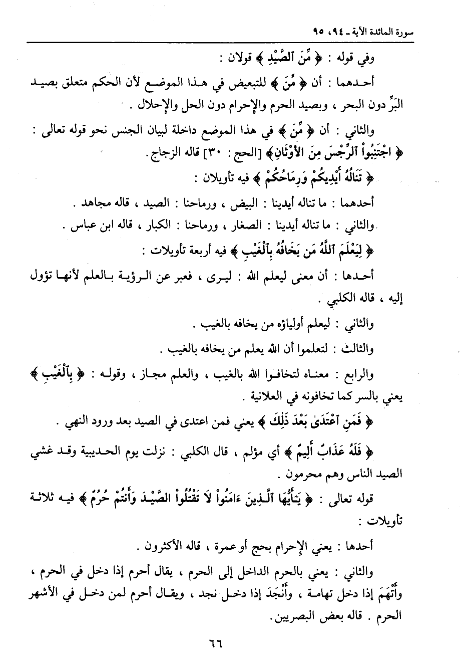 وفي قوله: {مِّنَ الصَّيْدِ} قولان: أحدهما: أن {مِّنَ} للتبعيض في هذا الموضع لأن الحكم متعلق بصيد البَرِّ دون البحر , وبصيد الحرم والإِحرام دون الحل والإِحلال. والثاني: أن {مِّنَ} في هذا الموضع داخلة لبيان الجنس نحو قوله تعالى: {اجْتَنِبُواْ الرِّجْسَ مِنَ الأوْثَانِ} [الحج: 30] قاله الزجاج. {تَنَالُهُ أَيْدِيكُمْ وَرِمَاحُكُمْ} فيه تأويلان: أحدهما: ما تناله أيدينا: البيض , ورماحنا: الصيد , قال مجاهد. والثاني: ما تناله أيدينا: الصغار , ورماحنا: الكبار , قاله ابن عباس. {لِيَعْلَمَ اللَّهُ مَن يَخَافُهُ بِالْغَيْبِ} فيه أربعة تأويلات: أحدها: أن معنى ليعلم الله: ليرى , فعبر عن الرؤية بالعلم لأنها تؤول إليه , قاله الكلبي. والثاني: ليعلم أولياؤه من يخافه بالغيب. والثالث: لتعلموا أن الله يعلم من يخافه بالغيب. والرابع: معناه لتخافوا الله بالغيب , والعلم مجاز , وقوله: {بِالْغَيْبِ} يعني بالسر كما تخافونه في العلانية. {فَمَنِ اعْتَدَى بَعْدَ ذَلِكَ} يعني فمن اعتدى في الصيد بعد ورود النهي. {فَلَهُ عَذَابٌ أَلِيمٌ} أي مؤلم , قال الكلبي: نزلت يوم الحديبية وقد غشي الصيد الناس وهم محرمون. قوله تعالى: {يَا أَيُّهَا الَّذِينَءَامَنُواْ لاَ تَقْتُلُواْ الصَّيْدَ وَأَنتُمْ حُرُمٌ} فيه ثلاثة تأويلات: أحدها: يعني الإِحرام بحج أو عمرة , قاله الأكثرون. والثاني: يعني بالحرم الداخل إلى الحرم , يقال أحرم إذا دخل في الحرم , وأَتْهَمَ إذا دخل تهامة , وأَنْجَدَ إذا دخل نجد , ويقال أحرم لمن دخل في الأشهر الحرم. قاله بعض البصريين.