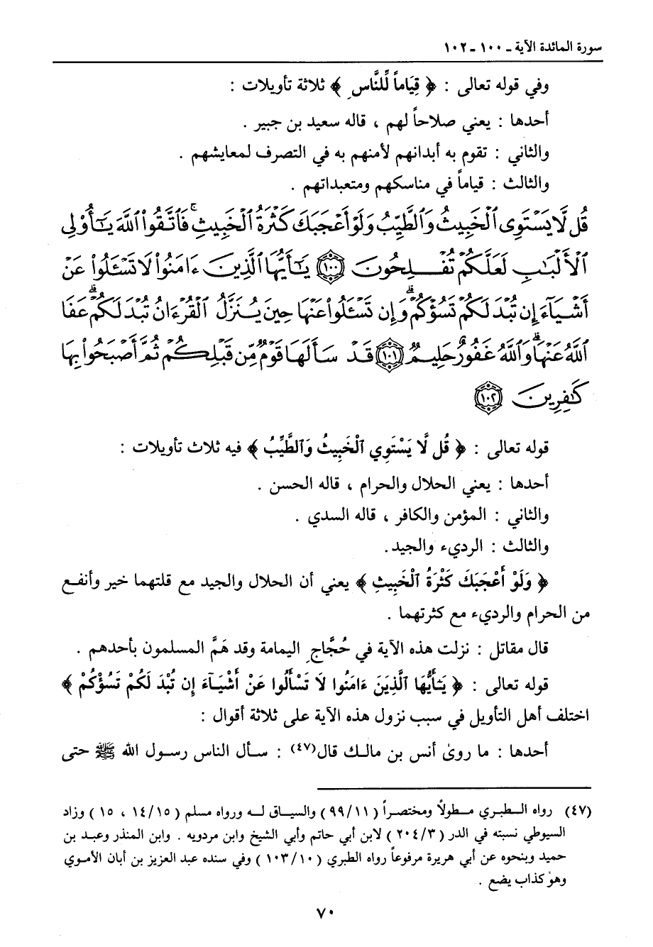 {قل لا يستوي الخبيث والطيب ولو أعجبك كثرة الخبيث فاتقوا الله يا أولي الألباب لعلكم تفلحون يا أيها الذين آمنوا لا تسألوا عن أشياء إن تبد لكم تسؤكم وإن تسألوا عنها حين ينزل القرآن تبد لكم عفا الله عنها والله غفور حليم قد سألها قوم من قبلكم ثم أصبحوا بها كافرين} قوله تعالى: {قُل لاَّ يَسْتَوِي الْخَبِيثُ وَالطَّيِّبُ} فيه ثلاث تأويلات: أحدها: يعني الحلال والحرام , قاله الحسن. والثاني: المؤمن والكافر , قاله السدي. والثالث: الرديء والجيد. {وَلَوْ أَعْجَبَكَ كَثْرَةُ الْخبِيثِ} يعني أن الحلال والجيد مع قلتهما خير وأنفع من الحرام والرديء مع كثرتهما. قال مقاتل: نزلت هذه الآية في حُجَّاجِ اليمامة وقد هَمَّ المسلمون بأحدهم. قوله تعالى: {يَا أَيُّهَا الَّذِينَءَامَنُواْ لاَ تَسْأَلُوا عَنْ أَشْيَآءَ إِن تُبْدَ لَكُمْ تَسُؤْكُمْ} اختلف أهل التأويل في سبب نزول هذه الآية على ثلاثة أقوال: أحدها: ما روى أنس بن مالك قال: سأل الناس رسول الله صلى الله عليه وسلم حتى