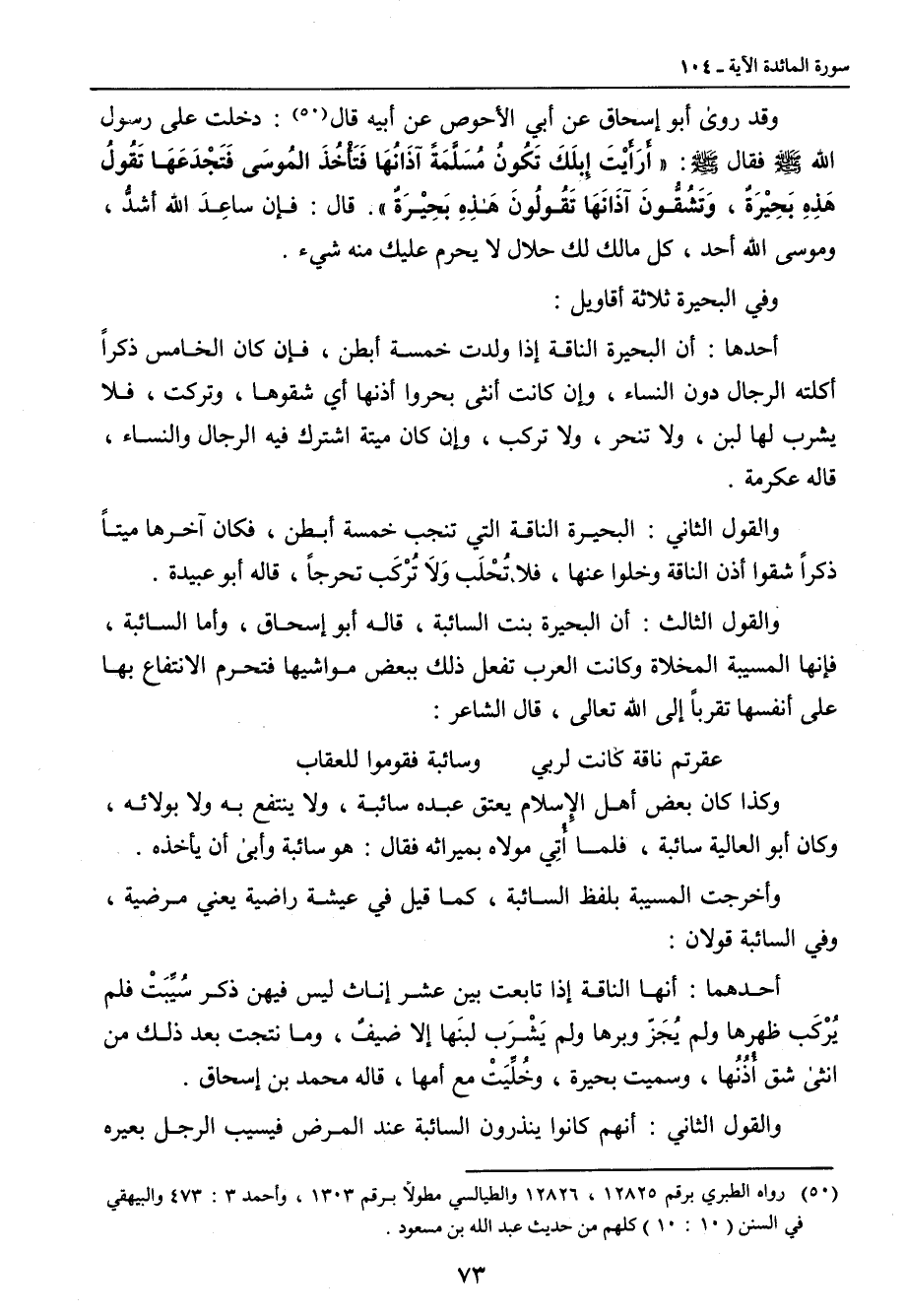 وكذا كان بعض أهل الإِسلام يعتق عبده سائبة , ولا ينتفع به ولا بولائه , وكان أبو العالية سائبة فلما أُتِي مولاه بميراثه فقال: هو سائبة وأبى أن يأخذه. وأخرجت المسيبة بلفظ السائبة , كما قيل في عيشة راضية يعني مرضية , وفي السائبة قولان: أحدهما: أنها الناقة إذا تابعت بين عشر إناث ليس فيهن ذكر سُيِّبَتْ فلم يُرْكَب ظهرها ولم يُجَزّ وبرها ولم يَشْرَب لبنَها إلا ضيفٌ , وما نتجت بعد ذلك من أنثى شق أُذُنُها , وسميت بحيرة , وخُلِّيَتْ مع أمها , قاله محمد بن إسحاق. والقول الثاني: أنهم كانوا ينذرون السائبة عند المرض فيسيب الرجل بعيره
