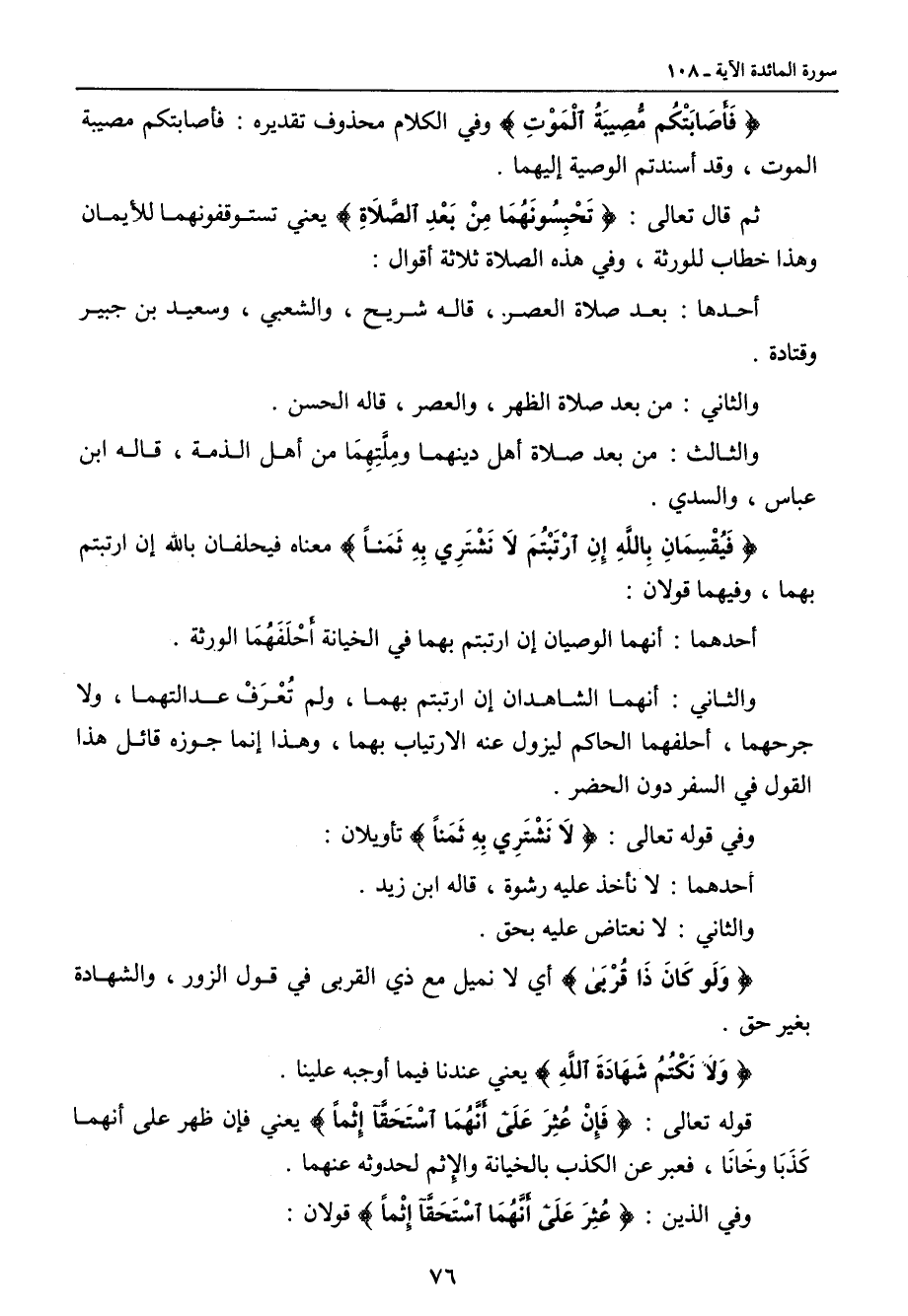 {فَأَصَابَتْكُم مُّصِيبَةُ الْمَوْتِ} وفي الكلام محذوف تقديره: فأصابتكم مصيبة الموت , وقد أسندتم الوصية إليهما. ثم قال تعالى: {تَحْبِسُونَهُمَا مِنْ بَعْدِ الصَّلاَةِ} يعني تستوقفونهما للأيمان وهذا خطاب للورثة , وفي هذه الصلاة ثلاثة أقوال: أحدها: بعد صلاة العصر , قاله شريح , والشعبي , وسعيد بن جبير وقتادة. والثاني: من بعد صلاة الظهر , والعصر , قاله الحسن. والثالث: من بعد صلاة أهل دينهما ومِلَّتِهِمَا من أهل الذمة , قاله ابن عباس , والسدي. {فَيُقْسِمَانِ بِاللَّهِ إِنِ أَرْتَبْتُمْ لاَ تَشْتَرِي بِهِ ثَمَناً} معناه فيحلفان بالله إن ارتبتم بهما , وفيهما قولان: